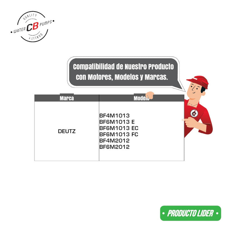 NEW WATER PUMP PREMIUM QUALITY INCLUDES: • Metal Impeller. • Installation Packaging. • Suitable for Industrial Machine. Improve the lifespan of your industrial machine. •Greater durability. •Water leak correction. •Free Shipping Nationwide. •100% Secure Purchase. To ensure your purchase is a good experience, we suggest observing the following points: 1.- COMPATIBILITY OF THE PART • Check that the part is compatible with your vehicle, compare it with the published photos and information. • Review Compatibility Table. 2.- DELIVERY TIME • Depending on your location is the time of reception of the product. • Enter your Zip Code to find out the Shipping Time and Methods. • Logistics, delivery times, and packaging depend on Mercado Libre. 3.- WARRANTY • All our products have a 60-day warranty (from the date you receive your product). • A broken, wet, burned, rusty and/or scale-infected part invalidates the warranty. 4.- INVOICE • Upon receiving your product, you can generate your invoice online (We'll send you the link in the purchase chat). 5.- RETURNS • The piece must come in good condition and with all accessories included. • Returns are not accepted if it has already been installed or used in your car. We are a Pumping Station with 50 years of experience. • Specialists in the Sale of Automotive Water Pumps. • For Diesel and Gasoline Engines. • All Brands and Applications (Cars, Trucks, Forklifts, Power Plants, Tractors).