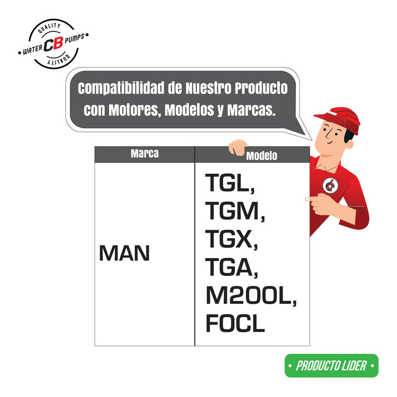 NEW WATER PUMP PREMIUM QUALITY INCLUDES: • Plastic Impeller. • Installation Packaging. • Truck Friendly. Improve the lifespan of your truck. •Greater durability. •Water leak correction. •Free Shipping Nationwide. •100% Secure Purchase. To ensure your purchase is a good experience, we suggest observing the following points: 1.- COMPATIBILITY OF THE PART • Check that the part is compatible with your vehicle, compare it with the published photos and information. • Review Compatibility Table. 2.- DELIVERY TIME • Depending on your location is the time of reception of the product. • Enter your Zip Code to find out the Shipping Time and Methods. • Logistics, delivery times, and packaging depend on Mercado Libre. 3.- WARRANTY • All our products have a 60-day warranty (from the date you receive your product). • A broken, wet, burned, rusty and/or scale-infected part invalidates the warranty. 4.- INVOICE • Upon receiving your product, you can generate your invoice online (We'll send you the link in the purchase chat). 5.- RETURNS • The piece must come in good condition and with all accessories included. • Returns are not accepted if it has already been installed or used in your car. We are a Pumping Station with 50 years of experience. • Specialists in the Sale of Automotive Water Pumps. • For Diesel and Gasoline Engines. • All Brands and Applications (Cars, Trucks, Forklifts, Power Plants, Tractors).