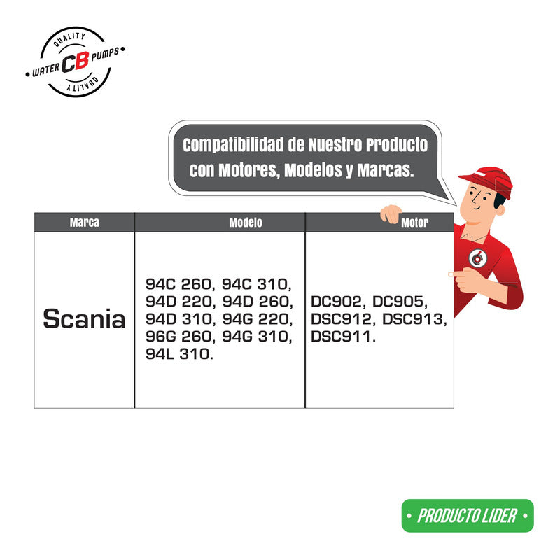 NEW WATER PUMP PREMIUM QUALITY INCLUDES: • Aluminum impeller. • Installation Packaging. • Suitable for Car/Truck. Improve the lifespan of your car. •Greater durability. •Water leak correction. •Free Shipping Nationwide. •100% Secure Purchase. To ensure your purchase is a good experience, we suggest observing the following points: 1.- COMPATIBILITY OF THE PART • Check that the part is compatible with your vehicle, compare it with the published photos and information. • Review Compatibility Table. 2.- DELIVERY TIME • Depending on your location is the time of reception of the product. • Enter your Zip Code to find out the Shipping Time and Methods. • Logistics, delivery times, and packaging depend on Mercado Libre. 3.- WARRANTY • All our products have a 60-day warranty (from the date you receive your product). • A broken, wet, burned, rusty and/or scale-infected part invalidates the warranty. 4.- INVOICE • Upon receiving your product, you can generate your invoice online (We'll send you the link in the purchase chat). 5.- RETURNS • The piece must come in good condition and with all accessories included. • Returns are not accepted if it has already been installed or used in your car. We are a Pumping Station with 50 years of experience. • Specialists in the Sale of Automotive Water Pumps. • For Diesel and Gasoline Engines. • All Brands and Applications (Cars, Trucks, Forklifts, Power Plants, Tractors).