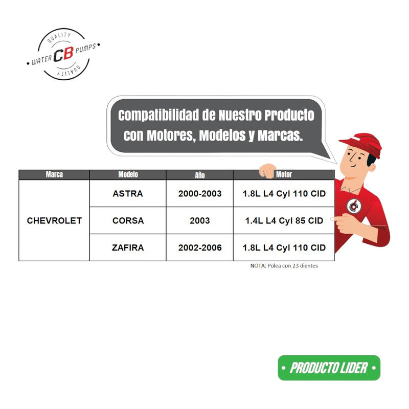 NEW WATER PUMP PREMIUM QUALITY INCLUDES: • Plastic Impeller. • 23-tooth pulley. • Installation Packaging. • Suitable for Car/Truck. Improve the lifespan of your car. •Greater durability. •Water leak correction. •Free Shipping Nationwide. •100% Secure Purchase. To ensure your purchase is a good experience, we suggest observing the following points: 1.- COMPATIBILITY OF THE PART • Check that the part is compatible with your vehicle, compare it with the published photos and information. • Review Compatibility Table. 2.- DELIVERY TIME • Depending on your location is the time of reception of the product. • Enter your Zip Code to find out the Shipping Time and Methods. • Logistics, delivery times, and packaging depend on Mercado Libre. 3.- WARRANTY • All our products have a 60-day warranty (from the date you receive your product). • A broken, wet, burned, rusty and/or scale-infected part invalidates the warranty. 4.- INVOICE • Upon receiving your product, you can generate your invoice online (We'll send you the link in the purchase chat). 5.- RETURNS • The piece must come in good condition and with all accessories included. • Returns are not accepted if it has already been installed or used in your car. We are a Pumping Station with 50 years of experience. • Specialists in the Sale of Automotive Water Pumps. • For Diesel and Gasoline Engines. • All Brands and Applications (Cars, Trucks, Forklifts, Power Plants, Tractors).
