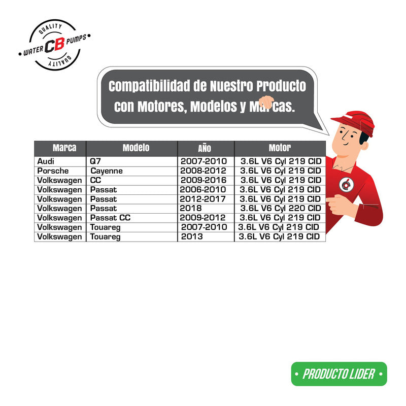 NEW WATER PUMP PREMIUM QUALITY INCLUDES: • Plastic Impeller. • Installation Packaging. • Suitable for Car/Truck. Improve the lifespan of your car. •Greater durability. •Water leak correction. •Free Shipping Nationwide. •100% Secure Purchase. To ensure your purchase is a good experience, we suggest observing the following points: 1.- COMPATIBILITY OF THE PART • Check that the part is compatible with your vehicle, compare it with the published photos and information. • Review Compatibility Table. 2.- DELIVERY TIME • Depending on your location is the time of reception of the product. • Enter your Zip Code to find out the Shipping Time and Methods. • Logistics, delivery times, and packaging depend on Mercado Libre. 3.- WARRANTY • All our products have a 60-day warranty (from the date you receive your product). • A broken, wet, burned, rusty and/or scale-infected part invalidates the warranty. 4.- INVOICE • Upon receiving your product, you can generate your invoice online (We'll send you the link in the purchase chat). 5.- RETURNS • The piece must come in good condition and with all accessories included. • Returns are not accepted if it has already been installed or used in your car. We are a Pumping Station with 50 years of experience. • Specialists in the Sale of Automotive Water Pumps. • For Diesel and Gasoline Engines. • All Brands and Applications (Cars, Trucks, Forklifts, Power Plants, Tractors).