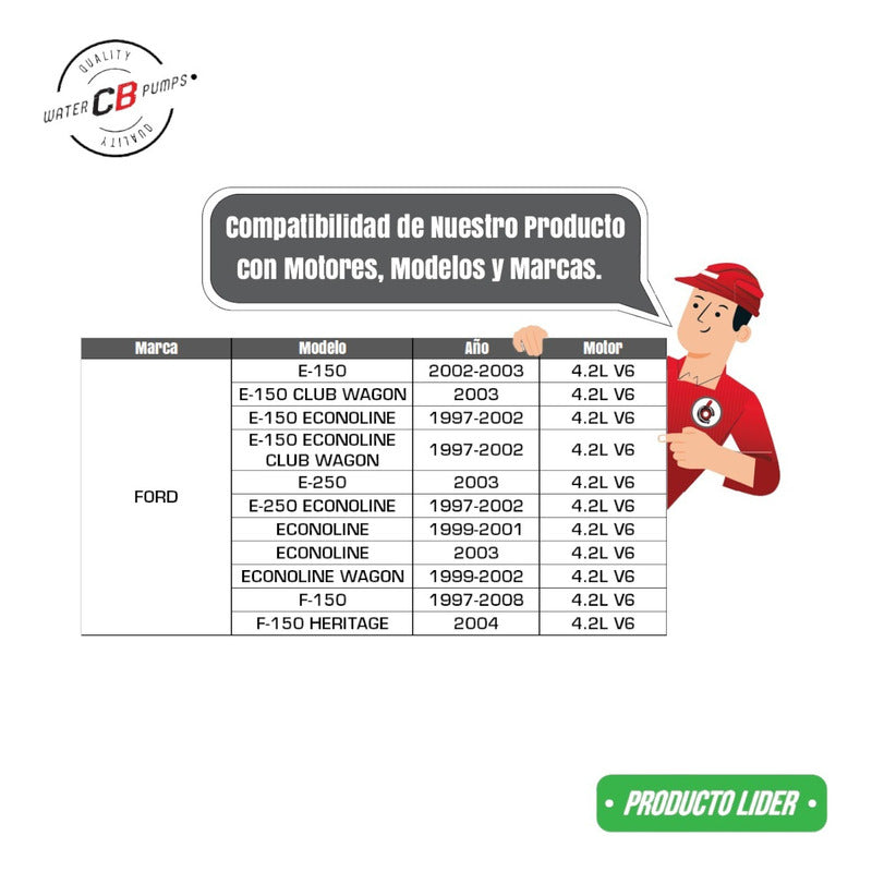 NEW WATER PUMP PREMIUM QUALITY INCLUDES: • Aluminum impeller. • Installation Packaging. • Suitable for Trucks. Improve the lifespan of your car/truck. •Greater durability. •Water leak correction. •Free Shipping Nationwide. •100% Secure Purchase. To ensure your purchase is a good experience, we suggest observing the following points: 1.- COMPATIBILITY OF THE PART • Check that the part is compatible with your vehicle, compare it with the published photos and information. • Review Compatibility Table. 2.- DELIVERY TIME • Depending on your location is the time of reception of the product. • Enter your Zip Code to find out the Shipping Time and Methods. • Logistics, delivery times, and packaging depend on Mercado Libre. 3.- WARRANTY • All our products have a 60-day warranty (from the date you receive your product). • A broken, wet, burned, rusty and/or scale-infected part invalidates the warranty. 4.- INVOICE • Upon receiving your product, you can generate your invoice online (We'll send you the link in the purchase chat). 5.- RETURNS • The piece must come in good condition and with all accessories included. • Returns are not accepted if it has already been installed or used in your car. We are a Pumping Station with 50 years of experience. • Specialists in the Sale of Automotive Water Pumps. • For Diesel and Gasoline Engines. • All Brands and Applications (Cars, Trucks, Forklifts, Power Plants, Tractors).
