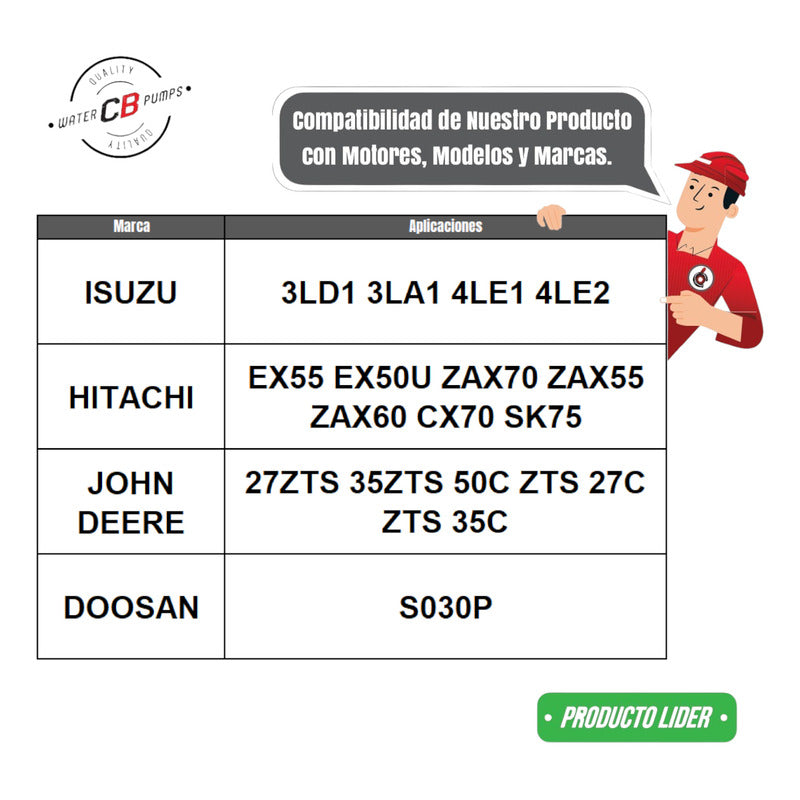 NEW WATER PUMP PREMIUM QUALITY INCLUDES: • Metal Impeller. • Installation Packaging. • Suitable for Excavator/Ind. Machinery Improve the lifespan of your machinery. •Greater durability. •Water leak correction. •Free Shipping Nationwide. •100% Secure Purchase. To ensure your purchase is a good experience, we suggest observing the following points: 1.- COMPATIBILITY OF THE PART • Check that the part is compatible with your vehicle, compare it with the published photos and information. • Review Compatibility Table. 2.- DELIVERY TIME • Depending on your location is the time of reception of the product. • Enter your Zip Code to find out the Shipping Time and Methods. • Logistics, delivery times, and packaging depend on Mercado Libre. 3.- WARRANTY • All our products have a 60-day warranty (from the date you receive your product). • A broken, wet, burned, rusty and/or scale-infected part invalidates the warranty. 4.- INVOICE • Upon receiving your product, you can generate your invoice online (We'll send you the link in the purchase chat). 5.- RETURNS • The piece must come in good condition and with all accessories included. • Returns are not accepted if it has already been installed or used in your car. We are a Pumping Station with 50 years of experience. • Specialists in the Sale of Automotive Water Pumps. • For Diesel and Gasoline Engines. • All Brands and Applications (Cars, Trucks, Forklifts, Power Plants, Tractors).