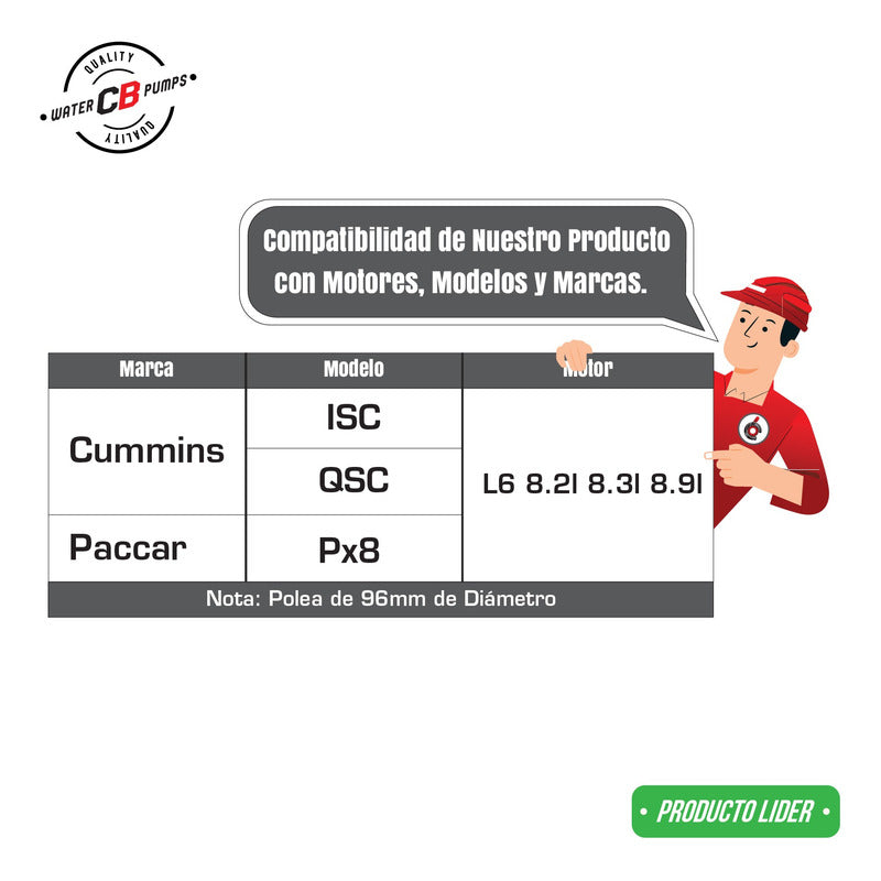 BOMBA DE AGUA NUEVA CALIDAD PREMIUM INCLUYE: • Impulsor de Plástico. • Polea de 96 mm. • Empaque de Instalación. • Apto para Camión. Mejora la vida útil de tu Camión. •Mayor durabilidad. •Corrección de fuga de Agua. •Envío Gratis a Todo el País. •Compra 100% Segura. Para que su compra sea una buena experiencia sugerimos observar los siguientes puntos: 1.- COMPATIBILIDAD DE LA PIEZA • Revise que la pieza sea compatible con su vehículo, compare con las fotos e información publicadas. • Revisar Tabla de Compatibilidades. 2.- TIEMPO DE ENTREGA • Dependiendo de su Localidad es el tiempo de recepción del producto. • Ingresa tu Código Postal para saber el Tiempo y formas de Envío. • La logística, tiempos de entrega y la paquetería, dependen de Mercado Libre. 3.- GARANTÍA • Todos nuestros productos tienen garantía válida por 60 días (A partir de la fecha de recibido su producto). • Pieza rota, mojada, quemada, con presencia de oxidación y/o sarro invalida la garantía. 4.- FACTURA • Al recibir su producto puede generar su factura en línea (Le enviamos su link en el chat de compra). 5.- DEVOLUCIONES • La pieza debe venir en buen estado y con todos los aditamentos incluidos. • No se aceptan devoluciones si ya fue instalada o usada en su auto. Somos Central de Bombas con 50 años de experiencia. • Especialistas en Venta de Bombas de Agua Automotrices. • Para Motores Diesel y Gasolina. • Todas las Marcas y Aplicaciones (Autos, Camiones, Montacargas, Plantas de Luz, Tractores).