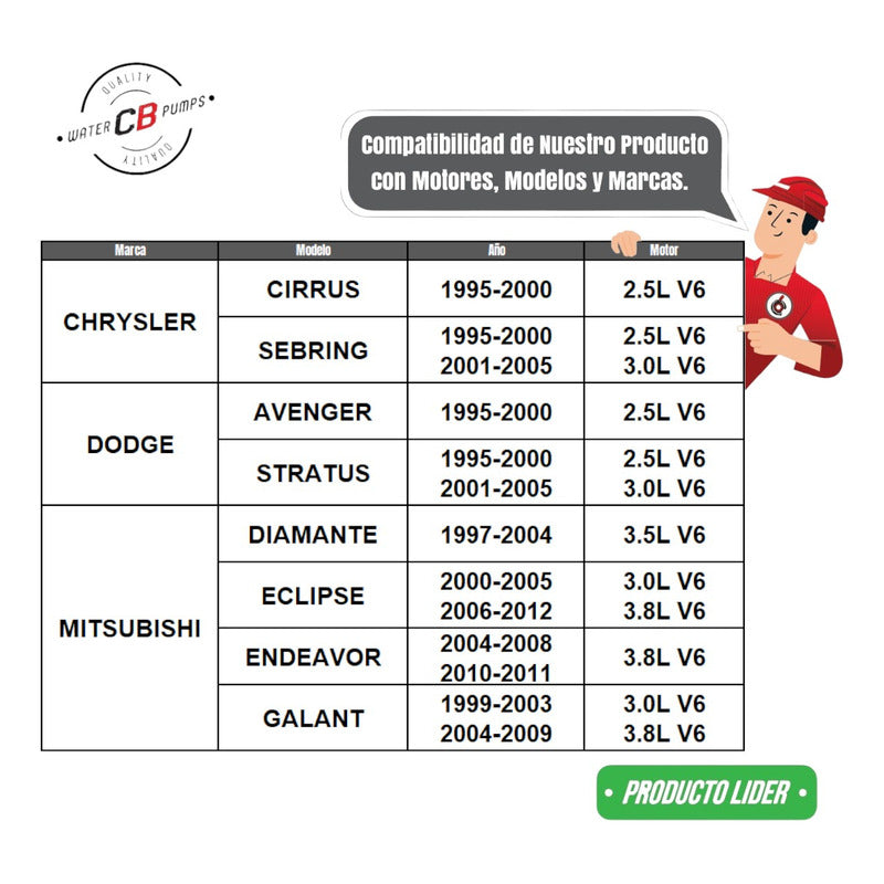 NEW WATER PUMP PREMIUM QUALITY INCLUDES: • Aluminum impeller. • Installation Packaging. • Suitable for Car/Truck. Improve the lifespan of your car. •Greater durability. •Water leak correction. •Free Shipping Nationwide. •100% Secure Purchase. To ensure your purchase is a good experience, we suggest observing the following points: 1.- COMPATIBILITY OF THE PART • Check that the part is compatible with your vehicle, compare it with the published photos and information. • Review Compatibility Table. 2.- DELIVERY TIME • Depending on your location is the time of reception of the product. • Enter your Zip Code to find out the Shipping Time and Methods. • Logistics, delivery times, and packaging depend on Mercado Libre. 3.- WARRANTY • All our products have a 60-day warranty (from the date you receive your product). • A broken, wet, burned, rusty and/or scale-infected part invalidates the warranty. 4.- INVOICE • Upon receiving your product, you can generate your invoice online (We'll send you the link in the purchase chat). 5.- RETURNS • The piece must come in good condition and with all accessories included. • Returns are not accepted if it has already been installed or used in your car. We are a Pumping Station with 50 years of experience. • Specialists in the Sale of Automotive Water Pumps. • For Diesel and Gasoline Engines. • All Brands and Applications (Cars, Trucks, Forklifts, Power Plants, Tractors).