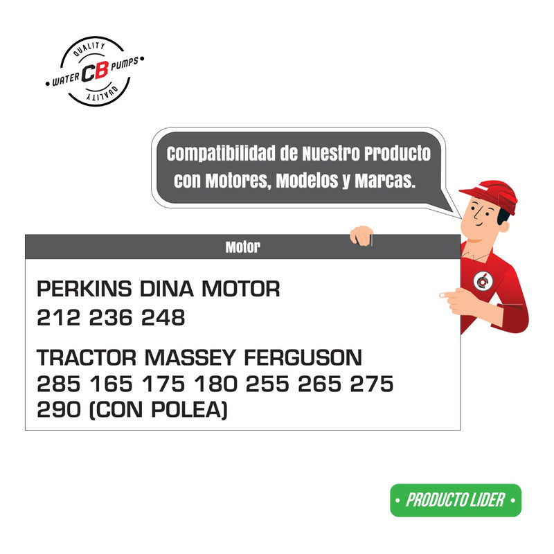 NEW WATER PUMP PREMIUM QUALITY INCLUDES: • Metallic Impeller. • Installation Packaging. • Suitable for Truck / Tractor Improve the lifespan of your truck. •Greater durability. •Water leak correction. •Free Shipping Nationwide. •100% Secure Purchase To ensure your purchase is a good experience, we suggest observing the following points: 1.- COMPATIBILITY OF THE PART • Check that the part is compatible with your vehicle, compare it with the published photos and information. • Review Compatibility Table. 2.- DELIVERY TIME • Depending on your location is the time of reception of the product. • Enter your Zip Code to find out the delivery time and methods. • Logistics, delivery times, and packaging depend on Mercado Libre. 3.- WARRANTY • All our products have a 60-day warranty (from the date you receive your product). • A broken, wet, burned, rusty and/or scale-infected part invalidates the warranty. 4.- INVOICE • Upon receiving your product, you can generate your invoice online (We'll send you the link in the purchase chat). 5.- RETURNS • The piece must come in good condition and with all accessories included. • Returns are not accepted if it has already been installed or used in your car. We are a Pumping Station with 50 years of experience. • Specialists in the Sale of Automotive Water Pumps. • For Diesel and Gasoline Engines. • All Brands and Applications (Cars, Trucks, Forklifts, Power Plants, Tractors).