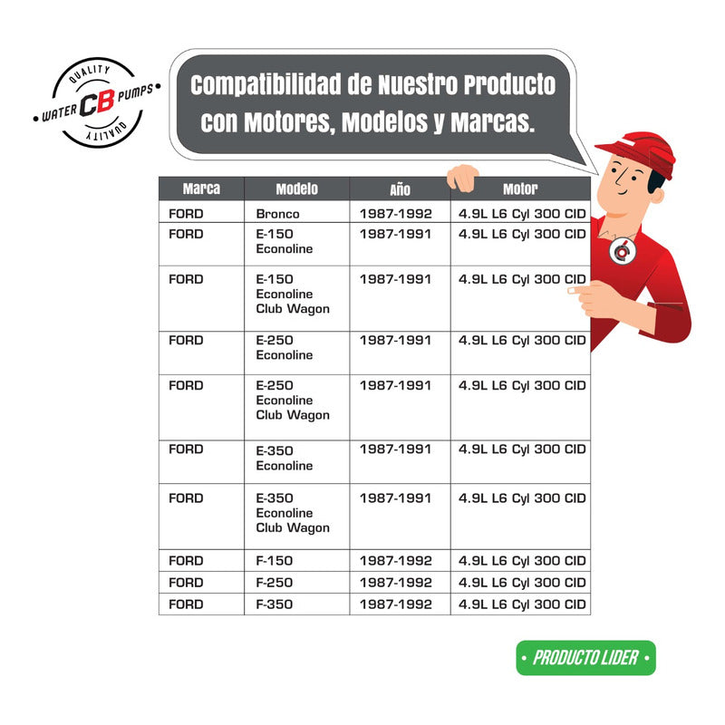 NEW WATER PUMP PREMIUM QUALITY INCLUDES: • Metallic Impeller. • Installation Packaging. • Suitable for Car/Truck Improve the lifespan of your car. •Greater durability. •Water leak correction. •Free Shipping Nationwide. •100% Secure Purchase To ensure your purchase is a good experience, we suggest observing the following points: 1.- COMPATIBILITY OF THE PART • Check that the part is compatible with your vehicle, compare it with the published photos and information. • Review Compatibility Table. 2.- DELIVERY TIME • Depending on your location is the time of reception of the product. • Enter your Zip Code to find out the delivery time and methods. • Logistics, delivery times, and packaging depend on Mercado Libre. 3.- WARRANTY • All our products have a 60-day warranty (from the date you receive your product). • A broken, wet, burned, rusty and/or scale-infected part invalidates the warranty. 4.- INVOICE • Upon receiving your product, you can generate your invoice online (We'll send you the link in the purchase chat). 5.- RETURNS • The piece must come in good condition and with all accessories included. • Returns are not accepted if it has already been installed or used in your car. We are a Pumping Station with 50 years of experience. • Specialists in the Sale of Automotive Water Pumps. • For Diesel and Gasoline Engines. • All Brands and Applications (Cars, Trucks, Forklifts, Power Plants, Tractors).