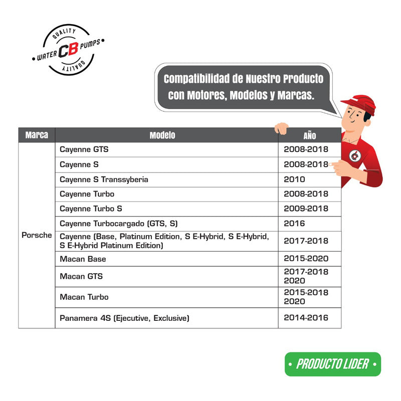 NEW WATER PUMP PREMIUM QUALITY INCLUDES: • Metal Impeller. • Installation Packaging. • Suitable for Car. Improve the lifespan of your car. •Greater durability. •Water leak correction. •Free Shipping Nationwide. •100% Secure Purchase. To ensure your purchase is a good experience, we suggest observing the following points: 1.- PART COMPATIBILITY • Check that the part is compatible with your vehicle, compare it with the published photos and information. • Review Compatibility Table. 2.- DELIVERY TIME • Depending on your location is the time of reception of the product. • Enter your Zip Code to find out the Shipping Time and Methods. • Logistics, delivery times, and packaging depend on Mercado Libre. 3.- WARRANTY • All our products have a 60-day warranty (from the date you receive your product). • A broken, wet, burned, rusty and/or scale-infected part invalidates the warranty. 4.- INVOICE • Upon receiving your product, you can generate your invoice online (We'll send you the link in the purchase chat). 5.- RETURNS • The piece must come in good condition and with all accessories included. • Returns are not accepted if it has already been installed or used in your car. We are a Pumping Station with 50 years of experience. • Specialists in the Sale of Automotive Water Pumps. • For Diesel and Gasoline Engines. • All Brands and Applications (Cars, Trucks, Forklifts, Power Plants, Tractors).