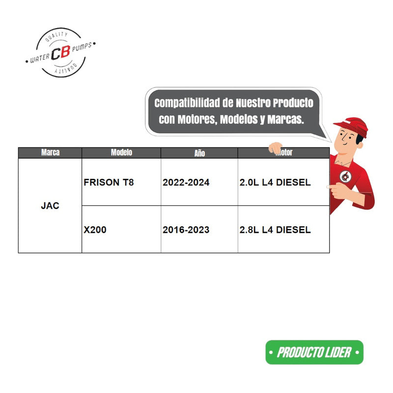 NEW WATER PUMP PREMIUM QUALITY NOTE: ONLY COMPATIBLE for DIESEL models, if you have any questions, please ask us, we are here to serve you. INCLUDES: • Metal Impeller. • Installation Packaging. • Suitable for Trucks. Improve the lifespan of your truck. •Greater durability. •Water leak correction. •Free Shipping Nationwide. •100% Secure Purchase. To ensure your purchase is a good experience, we suggest observing the following points: 1.- COMPATIBILITY OF THE PART • Check that the part is compatible with your vehicle, compare it with the published photos and information. • Review Compatibility Table. 2.- DELIVERY TIME • Depending on your location is the time of reception of the product. • Enter your Zip Code to find out the Shipping Time and Methods. • Logistics, delivery times, and packaging depend on Mercado Libre. 3.- WARRANTY • All our products have a 60-day warranty (from the date you receive your product). • A broken, wet, burned, rusty and/or scale-infected part invalidates the warranty. 4.- INVOICE • Upon receiving your product, you can generate your invoice online (We'll send you the link in the purchase chat). 5.- RETURNS • The piece must come in good condition and with all accessories included. • Returns are not accepted if it has already been installed or used in your car. We are a Pumping Station with 50 years of experience. • Specialists in the Sale of Automotive Water Pumps. • For Diesel and Gasoline Engines. • All Brands and Applications (Cars, Trucks, Forklifts, Power Plants, Tractors).
