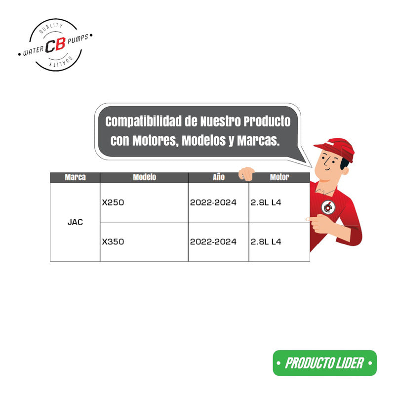 NEW WATER PUMP PREMIUM QUALITY INCLUDES: • Plastic Impeller. • Installation Packaging. • Suitable for Trucks. Improve the lifespan of your car/truck. •Greater durability. •Water leak correction. •Free Shipping Nationwide. •100% Secure Purchase. To ensure your purchase is a good experience, we suggest observing the following points: 1.- COMPATIBILITY OF THE PART • Check that the part is compatible with your vehicle, compare it with the published photos and information. • Review Compatibility Table. 2.- DELIVERY TIME • Depending on your location is the time of reception of the product. • Enter your Zip Code to find out the Shipping Time and Methods. • Logistics, delivery times, and packaging depend on Mercado Libre. 3.- WARRANTY • All our products have a 60-day warranty (from the date you receive your product). • A broken, wet, burned, rusty and/or scale-infected part invalidates the warranty. 4.- INVOICE • Upon receiving your product, you can generate your invoice online (We'll send you the link in the purchase chat). 5.- RETURNS • The piece must come in good condition and with all accessories included. • Returns are not accepted if it has already been installed or used in your car. We are a Pumping Station with 50 years of experience. • Specialists in the Sale of Automotive Water Pumps. • For Diesel and Gasoline Engines. • All Brands and Applications (Cars, Trucks, Forklifts, Power Plants, Tractors).