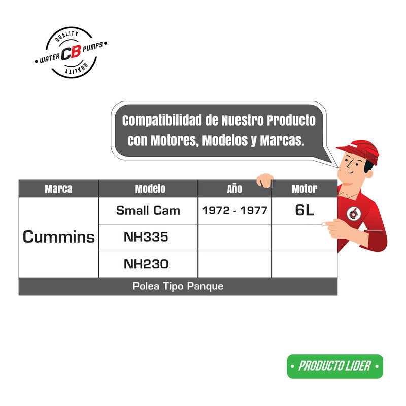 NEW WATER PUMP PREMIUM QUALITY INCLUDES: • Metal Impeller. • Installation Packaging. • Truck Friendly. Improve the lifespan of your truck. •Greater durability. •Water leak correction. •Free Shipping Nationwide. •100% Secure Purchase. To ensure your purchase is a good experience, we suggest observing the following points: 1.- COMPATIBILITY OF THE PART • Check that the part is compatible with your vehicle, compare it with the published photos and information. • Review Compatibility Table. 2.- DELIVERY TIME • Depending on your location is the time of reception of the product. • Enter your Zip Code to find out the Shipping Time and Methods. • Logistics, delivery times, and packaging depend on Mercado Libre. 3.- WARRANTY • All our products have a 60-day warranty (from the date you receive your product). • A broken, wet, burned, rusty and/or scale-infected part invalidates the warranty. 4.- INVOICE • Upon receiving your product, you can generate your invoice online (We'll send you the link in the purchase chat). 5.- RETURNS • The piece must come in good condition and with all accessories included. • Returns are not accepted if it has already been installed or used in your car. We are a Pumping Station with 50 years of experience. • Specialists in the Sale of Automotive Water Pumps. • For Diesel and Gasoline Engines. • All Brands and Applications (Cars, Trucks, Forklifts, Power Plants, Tractors).