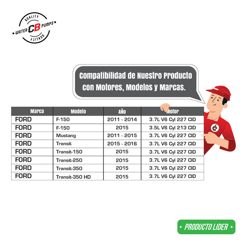 NEW WATER PUMP PREMIUM QUALITY INCLUDES: • Metal Impeller. • 4-hole flange. • Installation Packaging. • Suitable for Car/Truck. Improve the lifespan of your car/truck. •Greater durability. •Water leak correction. •Free Shipping Nationwide. •100% Secure Purchase. To ensure your purchase is a good experience, we suggest observing the following points: 1.- COMPATIBILITY OF THE PART • Check that the part is compatible with your vehicle, compare it with the published photos and information. • Review Compatibility Table. 2.- DELIVERY TIME • Depending on your location is the time of reception of the product. • Enter your Zip Code to find out the Shipping Time and Methods. • Logistics, delivery times, and packaging depend on Mercado Libre. 3.- WARRANTY • All our products have a 60-day warranty (from the date you receive your product). • A broken, wet, burned, rusty and/or scale-infected part invalidates the warranty. 4.- INVOICE • Upon receiving your product, you can generate your invoice online (We'll send you the link in the purchase chat). 5.- RETURNS • The piece must come in good condition and with all accessories included. • Returns are not accepted if it has already been installed or used in your car. We are a Pumping Station with 50 years of experience. • Specialists in the Sale of Automotive Water Pumps. • For Diesel and Gasoline Engines. • All Brands and Applications (Cars, Trucks, Forklifts, Power Plants, Tractors).