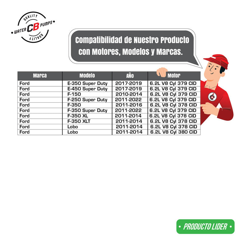 NEW WATER PUMP PREMIUM QUALITY INCLUDES: • Sheet Impeller. • Installation Packaging. • Suitable for Car/Truck. Improve the lifespan of your car. •Greater durability. •Water leak correction. •Free Shipping Nationwide. •100% Secure Purchase. To ensure your purchase is a good experience, we suggest observing the following points: 1.- COMPATIBILITY OF THE PART • Check that the part is compatible with your vehicle, compare it with the published photos and information. • Review Compatibility Table. 2.- DELIVERY TIME • Depending on your location is the time of reception of the product. • Enter your Zip Code to find out the Shipping Time and Methods. • Logistics, delivery times, and packaging depend on Mercado Libre. 3.- WARRANTY • All our products have a 60-day warranty (from the date you receive your product). • A broken, wet, burned, rusty and/or scale-infected part invalidates the warranty. 4.- INVOICE • Upon receiving your product, you can generate your invoice online (We'll send you the link in the purchase chat). 5.- RETURNS • The piece must come in good condition and with all accessories included. • Returns are not accepted if it has already been installed or used in your car. We are a Pumping Station with 50 years of experience. • Specialists in the Sale of Automotive Water Pumps. • For Diesel and Gasoline Engines. • All Brands and Applications (Cars, Trucks, Forklifts, Power Plants, Tractors).