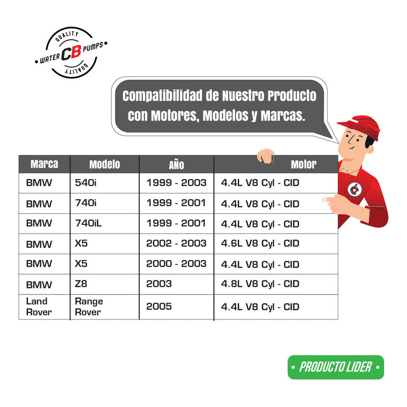 NEW WATER PUMP PREMIUM QUALITY INCLUDES: • Metal Impeller. • Installation Packaging. • Suitable for Car. Improve the lifespan of your car. •Greater durability. •Water leak correction. •Free Shipping Nationwide. •100% Secure Purchase. To ensure your purchase is a good experience, we suggest observing the following points: 1.- COMPATIBILITY OF THE PART • Check that the part is compatible with your vehicle, compare it with the published photos and information. • Review Compatibility Table. 2.- DELIVERY TIME • Depending on your location is the time of reception of the product. • Enter your Zip Code to find out the Shipping Time and Methods. • Logistics, delivery times, and packaging depend on Mercado Libre. 3.- WARRANTY • All our products have a 60-day warranty (from the date you receive your product). • A broken, wet, burned, rusty and/or scale-infected part invalidates the warranty. 4.- INVOICE • Upon receiving your product, you can generate your invoice online (We'll send you the link in the purchase chat). 5.- RETURNS • The piece must come in good condition and with all accessories included. • Returns are not accepted if it has already been installed or used in your car. We are a Pumping Station with 50 years of experience. • Specialists in the Sale of Automotive Water Pumps. • For Diesel and Gasoline Engines. • All Brands and Applications (Cars, Trucks, Forklifts, Power Plants, Tractors).