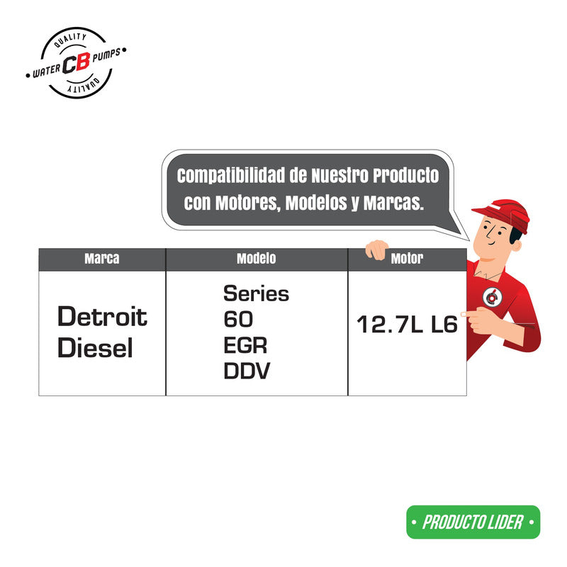 NEW WATER PUMP PREMIUM QUALITY INCLUDES: • Sheet Impeller. • Installation Packaging. • Truck Friendly. Improve the lifespan of your truck. •Greater durability. •Water leak correction. •Free Shipping Nationwide. •100% Secure Purchase. To ensure your purchase is a good experience, we suggest observing the following points: 1.- COMPATIBILITY OF THE PART • Check that the part is compatible with your vehicle, compare it with the published photos and information. • Review Compatibility Table. 2.- DELIVERY TIME • Depending on your location is the time of reception of the product. • Enter your Zip Code to find out the Shipping Time and Methods. • Logistics, delivery times, and packaging depend on Mercado Libre. 3.- WARRANTY • All our products have a 60-day warranty (from the date you receive your product). • A broken, wet, burned, rusty and/or scale-infected part invalidates the warranty. 4.- INVOICE • Upon receiving your product, you can generate your invoice online (We'll send you the link in the purchase chat). 5.- RETURNS • The piece must come in good condition and with all accessories included. • Returns are not accepted if it has already been installed or used in your car. We are a Pumping Station with 50 years of experience. • Specialists in the Sale of Automotive Water Pumps. • For Diesel and Gasoline Engines. • All Brands and Applications (Cars, Trucks, Forklifts, Power Plants, Tractors).