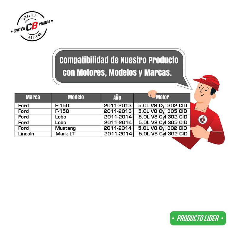 NEW WATER PUMP PREMIUM QUALITY INCLUDES: • Metal Impeller. • 4-hole flange. • Installation Packaging. • Suitable for Car/Truck. Improve the lifespan of your car. •Greater durability. •Water leak correction. •Free Shipping Nationwide. •100% Secure Purchase. To ensure your purchase is a good experience, we suggest observing the following points: 1.- COMPATIBILITY OF THE PART • Check that the part is compatible with your vehicle, compare it with the published photos and information. • Review Compatibility Table. 2.- DELIVERY TIME • Depending on your location is the time of reception of the product. • Enter your Zip Code to find out the Shipping Time and Methods. • Logistics, delivery times, and packaging depend on Mercado Libre. 3.- WARRANTY • All our products have a 60-day warranty (from the date you receive your product). • A broken, wet, burned, rusty and/or scale-infected part invalidates the warranty. 4.- INVOICE • Upon receiving your product, you can generate your invoice online (We'll send you the link in the purchase chat). 5.- RETURNS • The piece must come in good condition and with all accessories included. • Returns are not accepted if it has already been installed or used in your car. We are a Pumping Station with 50 years of experience. • Specialists in the Sale of Automotive Water Pumps. • For Diesel and Gasoline Engines. • All Brands and Applications (Cars, Trucks, Forklifts, Power Plants, Tractors).