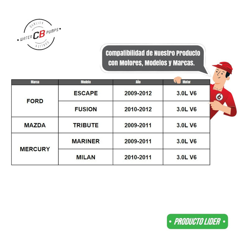 NEW WATER PUMP PREMIUM QUALITY INCLUDES: • Plastic Impeller. • Installation Packaging. • Suitable for Car/Truck. Improve the lifespan of your car. •Greater durability. •Water leak correction. •Free Shipping Nationwide. •100% Secure Purchase. To ensure your purchase is a good experience, we suggest observing the following points: 1.- COMPATIBILITY OF THE PART • Check that the part is compatible with your vehicle, compare it with the published photos and information. • Review Compatibility Table. 2.- DELIVERY TIME • Depending on your location is the time of reception of the product. • Enter your Zip Code to find out the Shipping Time and Methods. • Logistics, delivery times, and packaging depend on Mercado Libre. 3.- WARRANTY • All our products have a 60-day warranty (from the date you receive your product). • A broken, wet, burned, rusty and/or scale-infected part invalidates the warranty. 4.- INVOICE • Upon receiving your product, you can generate your invoice online (We'll send you the link in the purchase chat). 5.- RETURNS • The piece must come in good condition and with all accessories included. • Returns are not accepted if it has already been installed or used in your car. We are a Pumping Station with 50 years of experience. • Specialists in the Sale of Automotive Water Pumps. • For Diesel and Gasoline Engines. • All Brands and Applications (Cars, Trucks, Forklifts, Power Plants, Tractors).