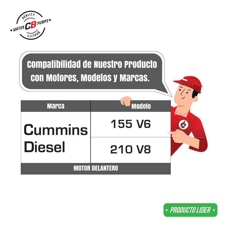 NEW WATER PUMP PREMIUM QUALITY INCLUDES: • Metal Impeller. • Installation Packaging. • Truck Friendly. Improve the lifespan of your truck. •Greater durability. •Water leak correction. •Free Shipping Nationwide. •100% Secure Purchase. To ensure your purchase is a good experience, we suggest observing the following points: 1.- PART COMPATIBILITY • Check that the part is compatible with your vehicle, compare it with the published photos and information. • Review Compatibility Table. 2.- DELIVERY TIME • Depending on your location is the time of reception of the product. • Enter your Zip Code to find out the Shipping Time and Methods. • Logistics, delivery times, and packaging depend on Mercado Libre. 3.- WARRANTY • All our products have a 60-day warranty (from the date you receive your product). • A broken, wet, burned, rusty and/or scale-infected part invalidates the warranty. 4.- INVOICE • Upon receiving your product, you can generate your invoice online (We'll send you the link in the purchase chat). 5.- RETURNS • The piece must come in good condition and with all accessories included. • Returns are not accepted if it has already been installed or used in your car. We are a Pumping Station with 50 years of experience. • Specialists in the Sale of Automotive Water Pumps. • For Diesel and Gasoline Engines. • All Brands and Applications (Cars, Trucks, Forklifts, Power Plants, Tractors).