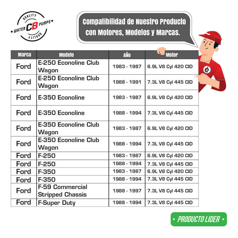 NEW WATER PUMP PREMIUM QUALITY INCLUDES: • Metal Impeller. • Installation Packaging. • Truck Friendly. Improve the lifespan of your truck. •Greater durability. •Water leak correction. •Free Shipping Nationwide. •100% Secure Purchase. To ensure your purchase is a good experience, we suggest observing the following points: 1.- COMPATIBILITY OF THE PART • Check that the part is compatible with your vehicle, compare it with the published photos and information. • Review Compatibility Table. 2.- DELIVERY TIME • Depending on your location is the time of reception of the product. • Enter your Zip Code to find out the Shipping Time and Methods. • Logistics, delivery times, and packaging depend on Mercado Libre. 3.- WARRANTY • All our products have a 60-day warranty (from the date you receive your product). • A broken, wet, burned, rusty and/or scale-infected part invalidates the warranty. 4.- INVOICE • Upon receiving your product, you can generate your invoice online (We'll send you the link in the purchase chat). 5.- RETURNS • The piece must come in good condition and with all accessories included. • Returns are not accepted if it has already been installed or used in your car. We are a Pumping Station with 50 years of experience. • Specialists in the Sale of Automotive Water Pumps. • For Diesel and Gasoline Engines. • All Brands and Applications (Cars, Trucks, Forklifts, Power Plants, Tractors).