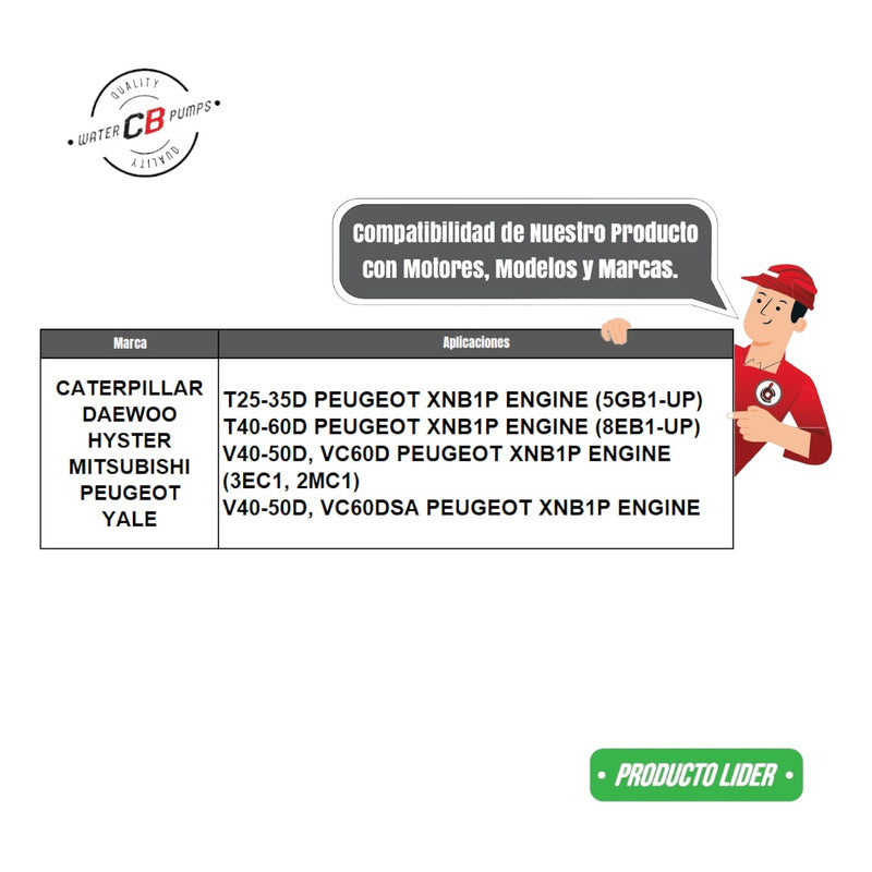 NEW WATER PUMP PREMIUM QUALITY INCLUDES: • Metal Impeller. • Installation Packaging. • Suitable for forklifts. Improve the lifespan of your forklift. •Greater durability. •Water leak correction. •Free Shipping Nationwide. •100% Secure Purchase. To ensure your purchase is a good experience, we suggest observing the following points: 1.- COMPATIBILITY OF THE PART • Check that the part is compatible with your vehicle, compare it with the published photos and information. • Review Compatibility Table. 2.- DELIVERY TIME • Depending on your location is the time of reception of the product. • Enter your Zip Code to find out the Shipping Time and Methods. • Logistics, delivery times, and packaging depend on Mercado Libre. 3.- WARRANTY • All our products have a 60-day warranty (from the date you receive your product). • A broken, wet, burned, rusty and/or scale-infected part invalidates the warranty. 4.- INVOICE • Upon receiving your product, you can generate your invoice online (We'll send you the link in the purchase chat). 5.- RETURNS • The piece must come in good condition and with all accessories included. • Returns are not accepted if it has already been installed or used in your car. We are a Pumping Station with 50 years of experience. • Specialists in the Sale of Automotive Water Pumps. • For Diesel and Gasoline Engines. • All Brands and Applications (Cars, Trucks, Forklifts, Power Plants, Tractors).