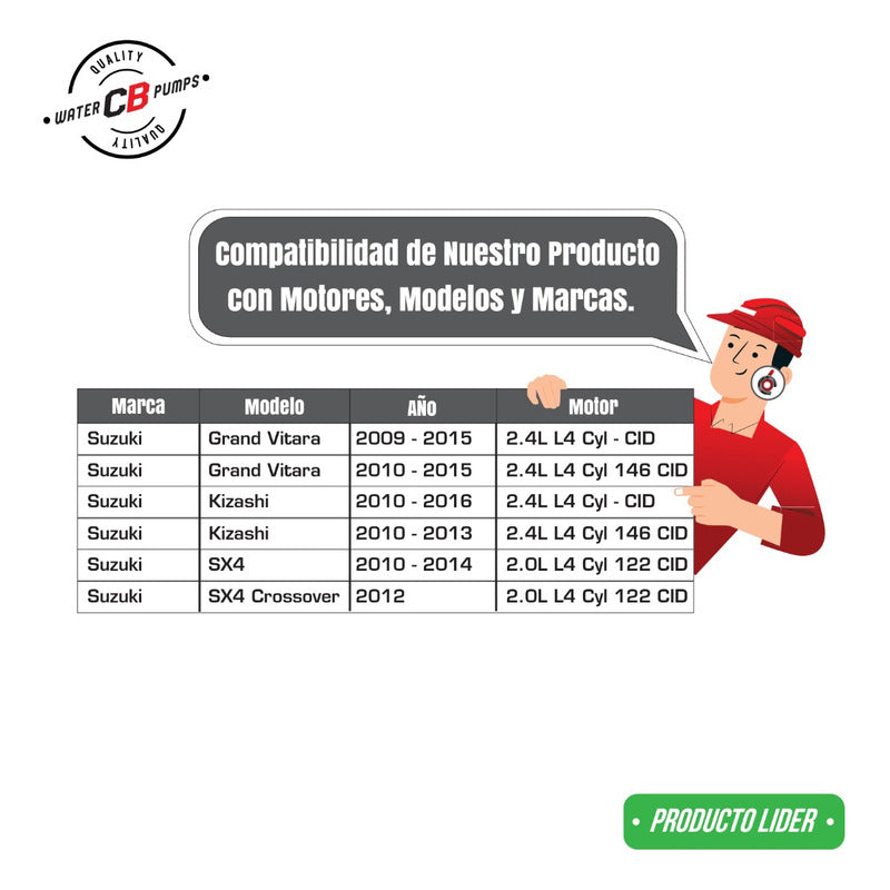 NEW WATER PUMP PREMIUM QUALITY INCLUDES: • Metallic Impeller. • Installation Packaging. • Suitable for Car. Improve the lifespan of your car. •Greater durability. •Water leak correction. •Free Shipping Nationwide. •100% Secure Purchase. To ensure your purchase is a good experience, we suggest observing the following points: 1.- COMPATIBILITY OF THE PART • Check that the part is compatible with your vehicle, compare it with the published photos and information. • Review Compatibility Table. 2.- DELIVERY TIME • Depending on your location is the time of reception of the product. • Enter your Zip Code to find out the Shipping Time and Methods. • Logistics, delivery times, and packaging depend on Mercado Libre. 3.- WARRANTY • All our products have a 60-day warranty (from the date you receive your product). • A broken, wet, burned, rusty and/or scale-infected part invalidates the warranty. 4.- INVOICE • Upon receiving your product, you can generate your invoice online (We'll send you the link in the purchase chat). 5.- RETURNS • The piece must come in good condition and with all accessories included. • Returns are not accepted if it has already been installed or used in your car. We are a Pumping Station with 50 years of experience. • Specialists in the Sale of Automotive Water Pumps. • For Diesel and Gasoline Engines. • All Brands and Applications (Cars, Trucks, Forklifts, Power Plants, Tractors).