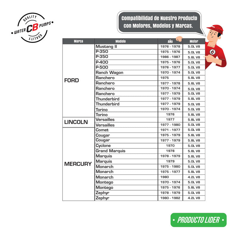 NEW WATER PUMP PREMIUM QUALITY IMPORTANT: This water pump is ONLY compatible with CARBURETED engines, please verify this information on your vehicle and physically check your pump before purchasing as there are several similar pumps, any questions please contact us, we are here to serve you. INCLUDES: • Sheet Impeller. • Installation Packaging. • Suitable for Car/Truck. Improve the lifespan of your car/truck. •Greater durability. •Water leak correction. •Free Shipping Nationwide. •100% Secure Purchase. To ensure your purchase is a good experience, we suggest observing the following points: 1.- COMPATIBILITY OF THE PART • Check that the part is compatible with your vehicle, compare it with the published photos and information. • Review Compatibility Table. 2.- DELIVERY TIME • Depending on your location is the time of reception of the product. • Enter your Zip Code to find out the Shipping Time and Methods. • Logistics, delivery times, and packaging depend on Mercado Libre. 3.- WARRANTY • All our products have a 60-day warranty (from the date you receive your product). • A broken, wet, burned, rusty and/or scale-infected part invalidates the warranty. 4.- INVOICE • Upon receiving your product, you can generate your invoice online (We'll send you the link in the purchase chat). 5.- RETURNS • The piece must come in good condition and with all accessories included. • Returns are not accepted if it has already been installed or used in your car. We are a Pumping Station with 50 years of experience. • Specialists in the Sale of Automotive Water Pumps. • For Diesel and Gasoline Engines. • All Brands and Applications (Cars, Trucks, Forklifts, Power Plants, Tractors).