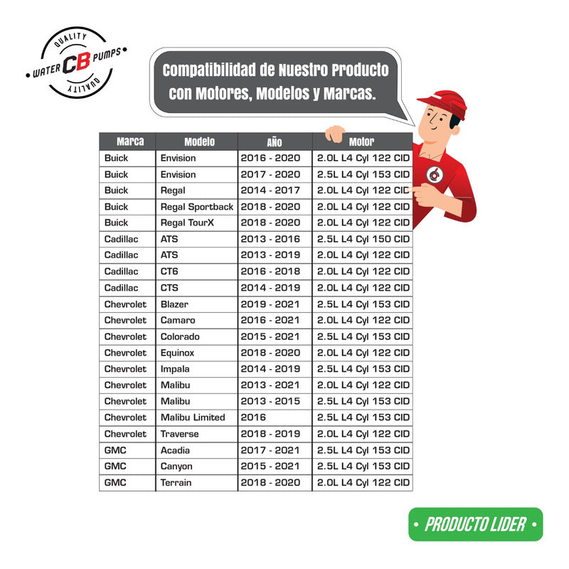 NEW WATER PUMP PREMIUM QUALITY INCLUDES: • Metal Impeller. • Installation Packaging. • Suitable for Car. Improve the lifespan of your car. •Greater durability. •Water leak correction. •Free Shipping Nationwide. •100% Secure Purchase. To ensure your purchase is a good experience, we suggest observing the following points: 1.- COMPATIBILITY OF THE PART • Check that the part is compatible with your vehicle, compare it with the published photos and information. • Review Compatibility Table. 2.- DELIVERY TIME • Depending on your location is the time of reception of the product. • Enter your Zip Code to find out the Shipping Time and Methods. • Logistics, delivery times, and packaging depend on Mercado Libre. 3.- WARRANTY • All our products have a 60-day warranty (from the date you receive your product). • A broken, wet, burned, rusty and/or scale-infected part invalidates the warranty. 4.- INVOICE • Upon receiving your product, you can generate your invoice online (We'll send you the link in the purchase chat). 5.- RETURNS • The piece must come in good condition and with all accessories included. • Returns are not accepted if it has already been installed or used in your car. We are a Pumping Station with 50 years of experience. • Specialists in the Sale of Automotive Water Pumps. • For Diesel and Gasoline Engines. • All Brands and Applications (Cars, Trucks, Forklifts, Power Plants, Tractors).