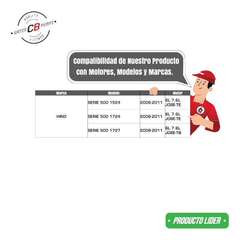 NEW WATER PUMP PREMIUM QUALITY INCLUDES: • Metal Impeller. • Installation Packaging. • Truck Friendly. Improve the lifespan of your truck. •Greater durability. •Water leak correction. •Free Shipping Nationwide. •100% Secure Purchase. To ensure your purchase is a good experience, we suggest observing the following points: 1.- COMPATIBILITY OF THE PART • Check that the part is compatible with your vehicle, compare it with the published photos and information. • Review Compatibility Table. 2.- DELIVERY TIME • Depending on your location is the time of reception of the product. • Enter your Zip Code to find out the Shipping Time and Methods. • Logistics, delivery times, and packaging depend on Mercado Libre. 3.- WARRANTY • All our products have a 60-day warranty (from the date you receive your product). • A broken, wet, burned, rusty and/or scale-infected part invalidates the warranty. 4.- INVOICE • Upon receiving your product, you can generate your invoice online (We'll send you the link in the purchase chat). 5.- RETURNS • The piece must come in good condition and with all accessories included. • Returns are not accepted if it has already been installed or used in your car. We are a Pumping Station with 50 years of experience. • Specialists in the Sale of Automotive Water Pumps. • For Diesel and Gasoline Engines. • All Brands and Applications (Cars, Trucks, Forklifts, Power Plants, Tractors).