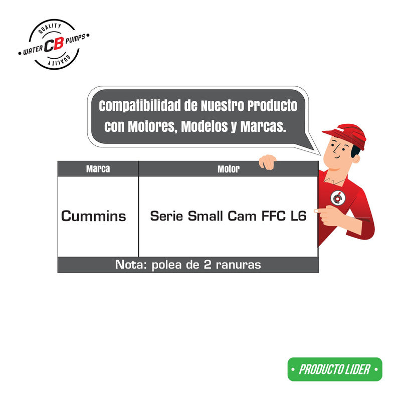 NEW WATER PUMP PREMIUM QUALITY INCLUDES: • Metal Impeller. • Installation Packaging. • Truck Friendly. Improve the lifespan of your truck. •Greater durability. •Water leak correction. •Free Shipping Nationwide. •100% Secure Purchase. To ensure your purchase is a good experience, we suggest observing the following points: 1.- PART COMPATIBILITY • Check that the part is compatible with your vehicle, compare it with the published photos and information. • Review Compatibility Table. 2.- DELIVERY TIME • Depending on your location is the time of reception of the product. • Enter your Zip Code to find out the Shipping Time and Methods. • Logistics, delivery times, and packaging depend on Mercado Libre. 3.- WARRANTY • All our products have a 60-day warranty (from the date you receive your product). • A broken, wet, burned, rusty and/or scale-infected part invalidates the warranty. 4.- INVOICE • Upon receiving your product, you can generate your invoice online (We'll send you the link in the purchase chat). 5.- RETURNS • The piece must come in good condition and with all accessories included. • Returns are not accepted if it has already been installed or used in your car. We are a Pumping Station with 50 years of experience. • Specialists in the Sale of Automotive Water Pumps. • For Diesel and Gasoline Engines. • All Brands and Applications (Cars, Trucks, Forklifts, Power Plants, Tractors).