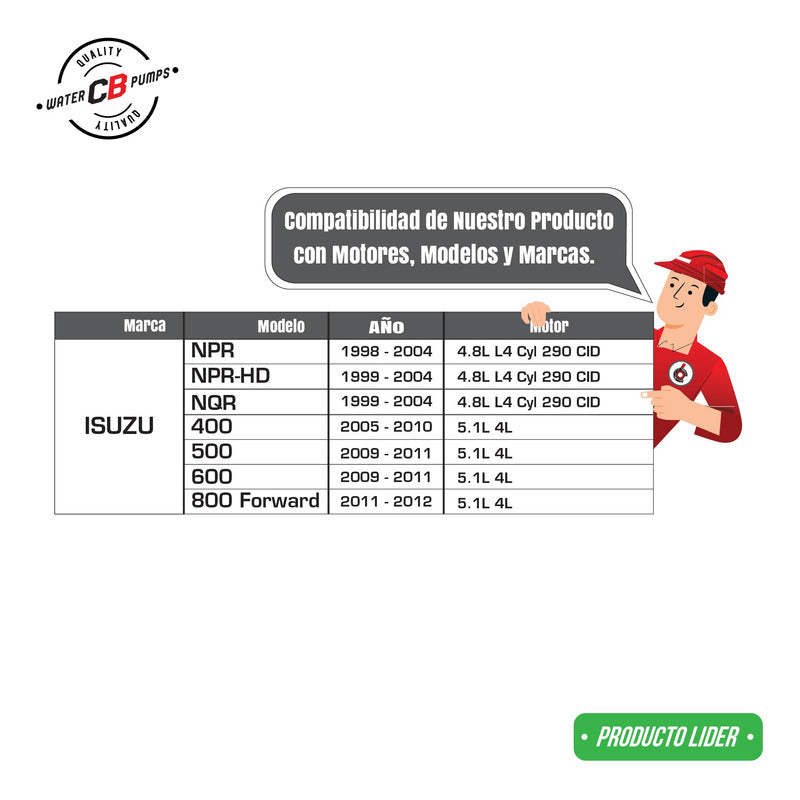 NEW WATER PUMP PREMIUM QUALITY INCLUDES: • Metal Impeller. • Installation Packaging. • Suitable for Car/Truck. Improve the lifespan of your car. •Greater durability. •Water leak correction. •Free Shipping Nationwide. •100% Secure Purchase. There are some Isuzu models where the water pump has a lower base-to-flange height (photo 2). If this is the case, check the following publication: https://articulo.mercadolibre.com.mx/MLM-2159233565-bomba-de-agua-isuzu-elf-400-500-600-51l-altura-baja-_JM To ensure your purchase is a good experience, we suggest observing the following points: 1.- COMPATIBILITY OF THE PART • Check that the part is compatible with your vehicle, compare it with the published photos and information. • Review Compatibility Table. 2.- DELIVERY TIME • Depending on your location is the time of reception of the product. • Enter your Zip Code to find out the Shipping Time and Methods. • Logistics, delivery times, and packaging depend on Mercado Libre. 3.- WARRANTY • All our products have a 60-day warranty (from the date you receive your product). • A broken, wet, burned, rusty and/or scale-infected part invalidates the warranty. 4.- INVOICE • Upon receiving your product, you can generate your invoice online (We'll send you the link in the purchase chat). 5.- RETURNS • The piece must come in good condition and with all accessories included. • Returns are not accepted if it has already been installed or used in your car. We are a Pumping Station with 50 years of experience. • Specialists in the Sale of Automotive Water Pumps. • For Diesel and Gasoline Engines. • All Brands and Applications (Cars, Trucks, Forklifts, Power Plants, Tractors).