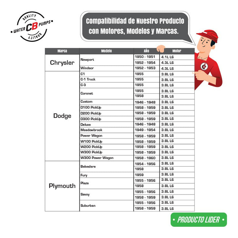 NEW WATER PUMP PREMIUM QUALITY INCLUDES: • Metal Impeller. • Installation Packaging. • Suitable for Car/Truck. Improve the lifespan of your car. •Greater durability. •Water leak correction. •Free Shipping Nationwide. •100% Secure Purchase. To ensure your purchase is a good experience, we suggest observing the following points: 1.- COMPATIBILITY OF THE PART • Check that the part is compatible with your vehicle, compare it with the published photos and information. • Review Compatibility Table. 2.- DELIVERY TIME • Depending on your location is the time of reception of the product. • Enter your Zip Code to find out the Shipping Time and Methods. • Logistics, delivery times, and packaging depend on Mercado Libre. 3.- WARRANTY • All our products have a 60-day warranty (from the date you receive your product). • A broken, wet, burned, rusty and/or scale-infected part invalidates the warranty. 4.- INVOICE • Upon receiving your product, you can generate your invoice online (We'll send you the link in the purchase chat). 5.- RETURNS • The piece must come in good condition and with all accessories included. • Returns are not accepted if it has already been installed or used in your car. We are a Pumping Station with 50 years of experience. • Specialists in the Sale of Automotive Water Pumps. • For Diesel and Gasoline Engines. • All Brands and Applications (Cars, Trucks, Forklifts, Power Plants, Tractors).