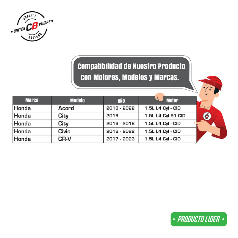 NEW WATER PUMP PREMIUM QUALITY INCLUDES: • Plastic Impeller. • Installation Packaging. • Suitable for Car/Truck. Improve the lifespan of your car. •Greater durability. •Water leak correction. •Free Shipping Nationwide. •100% Secure Purchase. To ensure your purchase is a good experience, we suggest observing the following points: 1.- COMPATIBILITY OF THE PART • Check that the part is compatible with your vehicle, compare it with the published photos and information. • Review Compatibility Table. 2.- DELIVERY TIME • Depending on your location is the time of reception of the product. • Enter your Zip Code to find out the Shipping Time and Methods. • Logistics, delivery times, and packaging depend on Mercado Libre. 3.- WARRANTY • All our products have a 60-day warranty (from the date you receive your product). • A broken, wet, burned, rusty and/or scale-infected part invalidates the warranty. 4.- INVOICE • Upon receiving your product, you can generate your invoice online (We'll send you the link in the purchase chat). 5.- RETURNS • The piece must come in good condition and with all accessories included. • Returns are not accepted if it has already been installed or used in your car. We are a Pumping Station with 50 years of experience. • Specialists in the Sale of Automotive Water Pumps. • For Diesel and Gasoline Engines. • All Brands and Applications (Cars, Trucks, Forklifts, Power Plants, Tractors).