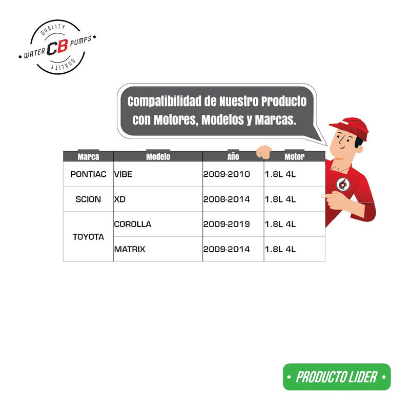NEW WATER PUMP PREMIUM QUALITY INCLUDES: • Metal Impeller. • Installation Packaging. • Suitable for Car/Truck. Improve the lifespan of your car. •Greater durability. •Water leak correction. •Free Shipping Nationwide. •100% Secure Purchase. To ensure your purchase is a good experience, we suggest observing the following points: 1.- PART COMPATIBILITY • Check that the part is compatible with your vehicle, compare it with the published photos and information. • Review Compatibility Table. 2.- DELIVERY TIME • Depending on your location is the time of reception of the product. • Enter your Zip Code to find out the Shipping Time and Methods. • Logistics, delivery times, and packaging depend on Mercado Libre. 3.- WARRANTY • All our products have a 60-day warranty (from the date you receive your product). • A broken, wet, burned, rusty and/or scale-infected part invalidates the warranty. 4.- INVOICE • Upon receiving your product, you can generate your invoice online (We'll send you the link in the purchase chat). 5.- RETURNS • The piece must come in good condition and with all accessories included. • Returns are not accepted if it has already been installed or used in your car. We are a Pumping Station with 50 years of experience. • Specialists in the Sale of Automotive Water Pumps. • For Diesel and Gasoline Engines. • All Brands and Applications (Cars, Trucks, Forklifts, Power Plants, Tractors).