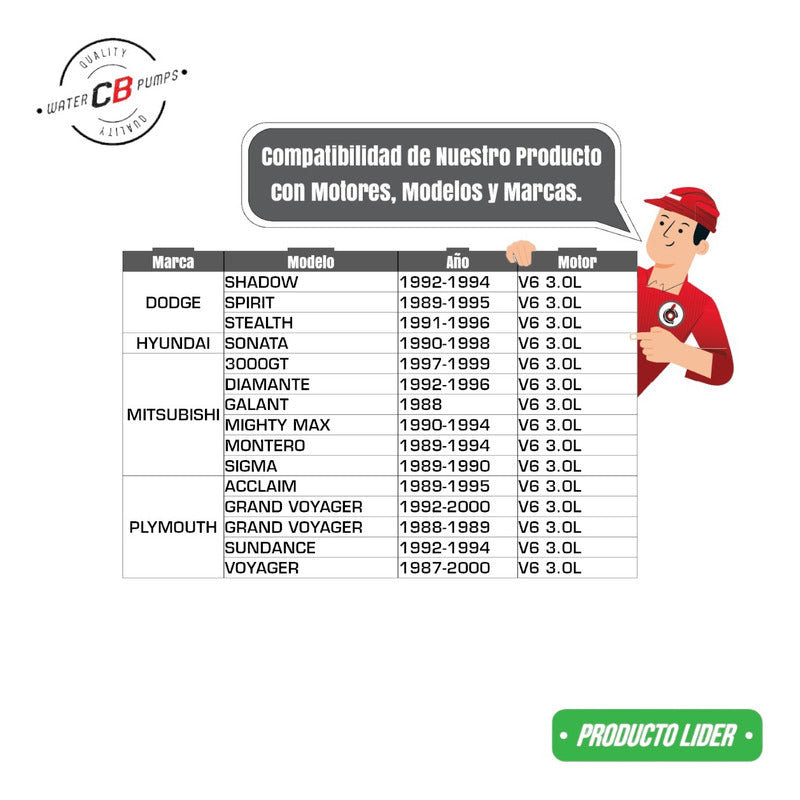 NEW WATER PUMP PREMIUM QUALITY INCLUDES: • Metal Impeller. • Installation Packaging. • Suitable for Car/Truck. Improve the lifespan of your car. •Greater durability. •Water leak correction. •Free Shipping Nationwide. •100% Secure Purchase. To ensure your purchase is a good experience, we suggest observing the following points: 1.- COMPATIBILITY OF THE PART • Check that the part is compatible with your vehicle, compare it with the published photos and information. • Review Compatibility Table. 2.- DELIVERY TIME • Depending on your location is the time of reception of the product. • Enter your Zip Code to find out the Shipping Time and Methods. • Logistics, delivery times, and packaging depend on Mercado Libre. 3.- WARRANTY • All our products have a 60-day warranty (from the date you receive your product). • A broken, wet, burned, rusty and/or scale-infected part invalidates the warranty. 4.- INVOICE • Upon receiving your product, you can generate your invoice online (We'll send you the link in the purchase chat). 5.- RETURNS • The piece must come in good condition and with all accessories included. • Returns are not accepted if it has already been installed or used in your car. We are a Pumping Station with 50 years of experience. • Specialists in the Sale of Automotive Water Pumps. • For Diesel and Gasoline Engines. • All Brands and Applications (Cars, Trucks, Forklifts, Power Plants, Tractors).