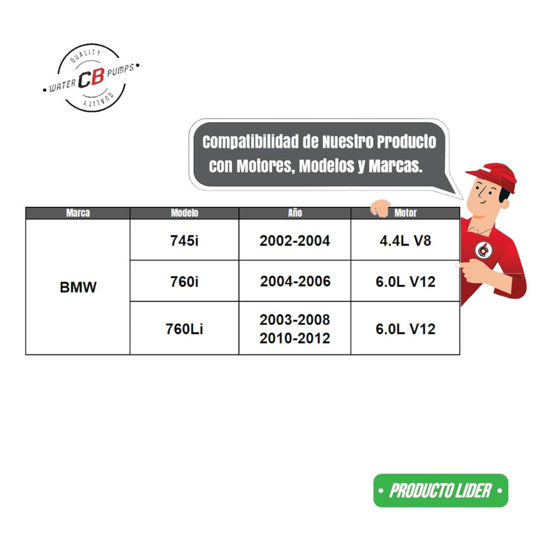 NEW WATER PUMP PREMIUM QUALITY INCLUDES: • Metal Impeller. • Installation Packaging. • Suitable for Car. Improve the lifespan of your car. •Greater durability. •Water leak correction. •Free Shipping Nationwide. •100% Secure Purchase. To ensure your purchase is a good experience, we suggest observing the following points: 1.- COMPATIBILITY OF THE PART • Check that the part is compatible with your vehicle, compare it with the published photos and information. • Review Compatibility Table. 2.- DELIVERY TIME • Depending on your location is the time of reception of the product. • Enter your Zip Code to find out the Shipping Time and Methods. • Logistics, delivery times, and packaging depend on Mercado Libre. 3.- WARRANTY • All our products have a 60-day warranty (from the date you receive your product). • A broken, wet, burned, rusty and/or scale-infected part invalidates the warranty. 4.- INVOICE • Upon receiving your product, you can generate your invoice online (We'll send you the link in the purchase chat). 5.- RETURNS • The piece must come in good condition and with all accessories included. • Returns are not accepted if it has already been installed or used in your car. We are a Pumping Station with 50 years of experience. • Specialists in the Sale of Automotive Water Pumps. • For Diesel and Gasoline Engines. • All Brands and Applications (Cars, Trucks, Forklifts, Power Plants, Tractors).