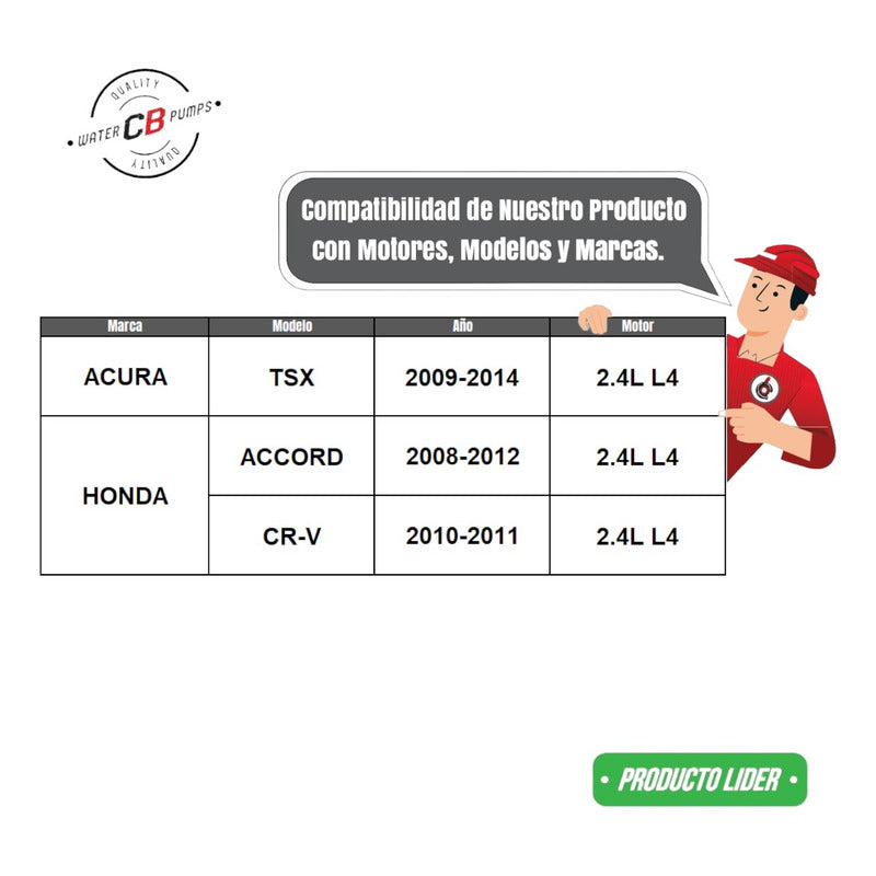 NEW WATER PUMP PREMIUM QUALITY INCLUDES: • Metal Impeller. • Installation Packaging. • Suitable for Car/Truck. Improve the lifespan of your car. •Greater durability. •Water leak correction. •Free Shipping Nationwide. •100% Secure Purchase. To ensure your purchase is a good experience, we suggest observing the following points: 1.- COMPATIBILITY OF THE PART • Check that the part is compatible with your vehicle, compare it with the published photos and information. • Review Compatibility Table. 2.- DELIVERY TIME • Depending on your location is the time of reception of the product. • Enter your Zip Code to find out the Shipping Time and Methods. • Logistics, delivery times, and packaging depend on Mercado Libre. 3.- WARRANTY • All our products have a 60-day warranty (from the date you receive your product). • A broken, wet, burned, rusty and/or scale-infected part invalidates the warranty. 4.- INVOICE • Upon receiving your product, you can generate your invoice online (We'll send you the link in the purchase chat). 5.- RETURNS • The piece must come in good condition and with all accessories included. • Returns are not accepted if it has already been installed or used in your car. We are a Pumping Station with 50 years of experience. • Specialists in the Sale of Automotive Water Pumps. • For Diesel and Gasoline Engines. • All Brands and Applications (Cars, Trucks, Forklifts, Power Plants, Tractors).