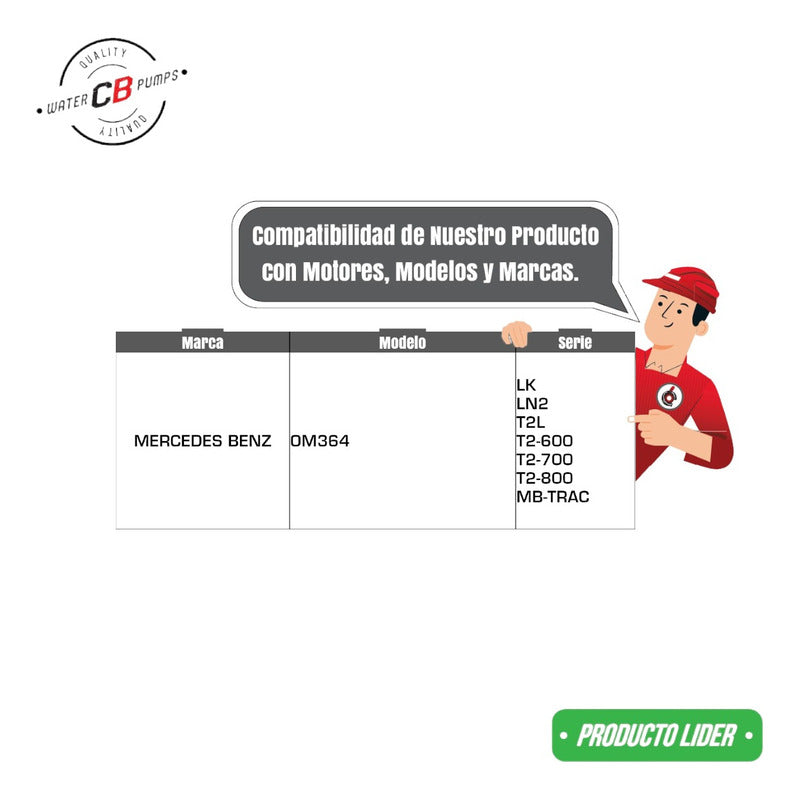 NEW WATER PUMP PREMIUM QUALITY INCLUDES: • Plastic Impeller. • Installation Packaging. • Truck Friendly. Improve the lifespan of your truck. •Greater durability. •Water leak correction. •Free Shipping Nationwide. •100% Secure Purchase. To ensure your purchase is a good experience, we suggest observing the following points: 1.- PART COMPATIBILITY • Check that the part is compatible with your vehicle, compare it with the published photos and information. • Review Compatibility Table. 2.- DELIVERY TIME • Depending on your location is the time of reception of the product. • Enter your Zip Code to find out the Shipping Time and Methods. • Logistics, delivery times, and packaging depend on Mercado Libre. 3.- WARRANTY • All our products have a 60-day warranty (from the date you receive your product). • A broken, wet, burned, rusty and/or scale-infected part invalidates the warranty. 4.- INVOICE • Upon receiving your product, you can generate your invoice online (We'll send you the link in the purchase chat). 5.- RETURNS • The piece must come in good condition and with all accessories included. • Returns are not accepted if it has already been installed or used in your car. We are a Pumping Station with 50 years of experience. • Specialists in the Sale of Automotive Water Pumps. • For Diesel and Gasoline Engines. • All Brands and Applications (Cars, Trucks, Forklifts, Power Plants, Tractors).