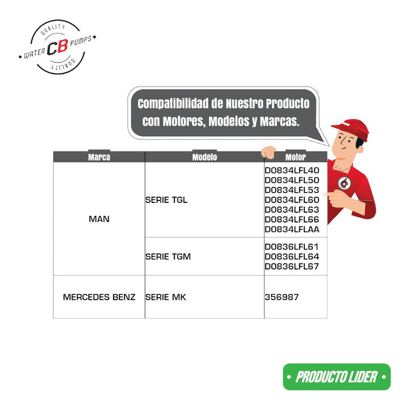 NEW WATER PUMP PREMIUM QUALITY NOTE: LARGE CONNECTION M 16X1.5 INCLUDES: • Plastic Impeller. • Installation Packaging. • Suitable for Truck or Industrial Machine. Improve the lifespan of your truck or industrial machine. •Greater durability. •Water leak correction. •Free Shipping Nationwide. •100% Secure Purchase. To ensure your purchase is a good experience, we suggest observing the following points: 1.- COMPATIBILITY OF THE PART • Check that the part is compatible with your vehicle, compare it with the published photos and information. • Review Compatibility Table. 2.- DELIVERY TIME • Depending on your location is the time of reception of the product. • Enter your Zip Code to find out the Shipping Time and Methods. • Logistics, delivery times, and packaging depend on Mercado Libre. 3.- WARRANTY • All our products have a 60-day warranty (from the date you receive your product). • A broken, wet, burned, rusty and/or scale-infected part invalidates the warranty. 4.- INVOICE • Upon receiving your product, you can generate your invoice online (We'll send you the link in the purchase chat). 5.- RETURNS • The piece must come in good condition and with all accessories included. • Returns are not accepted if it has already been installed or used in your car. We are a Pumping Station with 50 years of experience. • Specialists in the Sale of Automotive Water Pumps. • For Diesel and Gasoline Engines. • All Brands and Applications (Cars, Trucks, Forklifts, Power Plants, Tractors).