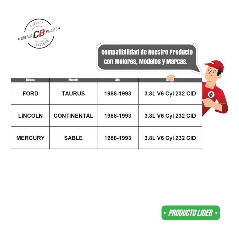 NEW WATER PUMP PREMIUM QUALITY INCLUDES: • Metal Impeller. • Installation Packaging. • Suitable for Car/Truck. Improve the lifespan of your car. •Greater durability. •Water leak correction. •Free Shipping Nationwide. •100% Secure Purchase. To ensure your purchase is a good experience, we suggest observing the following points: 1.- COMPATIBILITY OF THE PART • Check that the part is compatible with your vehicle, compare it with the published photos and information. • Review Compatibility Table. 2.- DELIVERY TIME • Depending on your location is the time of reception of the product. • Enter your Zip Code to find out the Shipping Time and Methods. • Logistics, delivery times, and packaging depend on Mercado Libre. 3.- WARRANTY • All our products have a 60-day warranty (from the date you receive your product). • A broken, wet, burned, rusty and/or scale-infected part invalidates the warranty. 4.- INVOICE • Upon receiving your product, you can generate your invoice online (We'll send you the link in the purchase chat). 5.- RETURNS • The piece must come in good condition and with all accessories included. • Returns are not accepted if it has already been installed or used in your car. We are a Pumping Station with 50 years of experience. • Specialists in the Sale of Automotive Water Pumps. • For Diesel and Gasoline Engines. • All Brands and Applications (Cars, Trucks, Forklifts, Power Plants, Tractors).