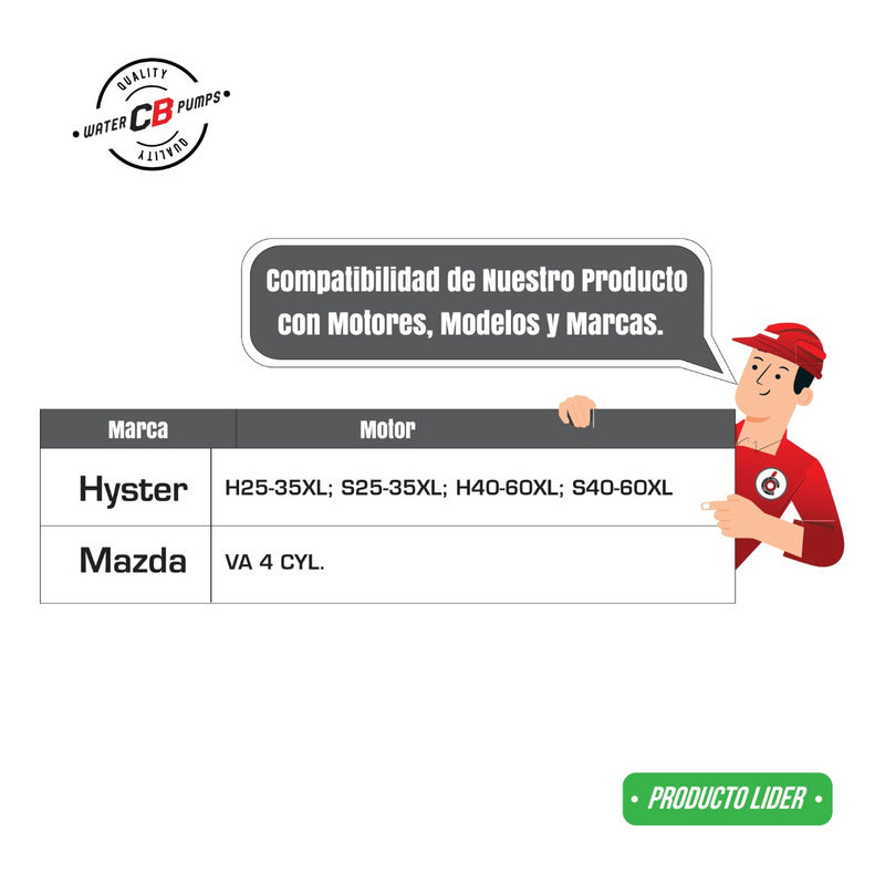 NEW WATER PUMP PREMIUM QUALITY INCLUDES: • Metallic Impeller. • Packaging and Water Intake. • Suitable for forklifts. Improve the lifespan of your forklift. •Greater durability. •Water leak correction. •Free Shipping Nationwide. •100% Secure Purchase. To ensure your purchase is a good experience, we suggest observing the following points: 1.- COMPATIBILITY OF THE PART • Check that the part is compatible with your vehicle, compare it with the published photos and information. • Review Compatibility Table. 2.- DELIVERY TIME • Depending on your location is the time of reception of the product. • Enter your Zip Code to find out the Shipping Time and Methods. • Logistics, delivery times, and packaging depend on Mercado Libre. 3.- WARRANTY • All our products have a 60-day warranty (from the date you receive your product). • A broken, wet, burned, rusty and/or scale-infected part invalidates the warranty. 4.- INVOICE • Upon receiving your product, you can generate your invoice online (We'll send you the link in the purchase chat). 5.- RETURNS • The piece must come in good condition and with all accessories included. • Returns are not accepted if it has already been installed or used in your car. We are a Pumping Station with 50 years of experience. • Specialists in the Sale of Automotive Water Pumps. • For Diesel and Gasoline Engines. • All Brands and Applications (Cars, Trucks, Forklifts, Power Plants, Tractors).