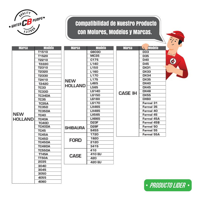 NEW WATER PUMP PREMIUM QUALITY INCLUDES: • Metal Impeller. • Installation Packaging. • Suitable for Tractor. Improve the lifespan of your Tractor. •Greater durability. •Water leak correction. •Free Shipping Nationwide. •100% Secure Purchase. To ensure your purchase is a good experience, we suggest observing the following points: 1.- COMPATIBILITY OF THE PART • Check that the part is compatible with your vehicle, compare it with the published photos and information. • Review Compatibility Table. 2.- DELIVERY TIME • Depending on your location is the time of reception of the product. • Enter your Zip Code to find out the Shipping Time and Methods. • Logistics, delivery times, and packaging depend on Mercado Libre. 3.- WARRANTY • All our products have a 60-day warranty (from the date you receive your product). • A broken, wet, burned, rusty and/or scale-infected part invalidates the warranty. 4.- INVOICE • Upon receiving your product, you can generate your invoice online (We'll send you the link in the purchase chat). 5.- RETURNS • The piece must come in good condition and with all accessories included. • Returns are not accepted if it has already been installed or used in your car. We are a Pumping Station with 50 years of experience. • Specialists in the Sale of Automotive Water Pumps. • For Diesel and Gasoline Engines. • All Brands and Applications (Cars, Trucks, Forklifts, Power Plants, Tractors).
