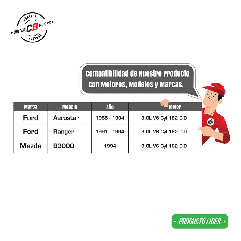 NEW WATER PUMP PREMIUM QUALITY INCLUDES: • Sheet Impeller. • Installation Packaging. • Suitable for Trucks. Improve the lifespan of your car. •Greater durability. •Water leak correction. •Free Shipping Nationwide. •100% Secure Purchase. To ensure your purchase is a good experience, we suggest observing the following points: 1.- COMPATIBILITY OF THE PART • Check that the part is compatible with your vehicle, compare it with the published photos and information. • Review Compatibility Table. 2.- DELIVERY TIME • Depending on your location is the time of reception of the product. • Enter your Zip Code to find out the Shipping Time and Methods. • Logistics, delivery times, and packaging depend on Mercado Libre. 3.- WARRANTY • All our products have a 60-day warranty (from the date you receive your product). • A broken, wet, burned, rusty and/or scale-infected part invalidates the warranty. 4.- INVOICE • Upon receiving your product, you can generate your invoice online (We'll send you the link in the purchase chat). 5.- RETURNS • The piece must come in good condition and with all accessories included. • Returns are not accepted if it has already been installed or used in your car. We are a Pumping Station with 50 years of experience. • Specialists in the Sale of Automotive Water Pumps. • For Diesel and Gasoline Engines. • All Brands and Applications (Cars, Trucks, Forklifts, Power Plants, Tractors).