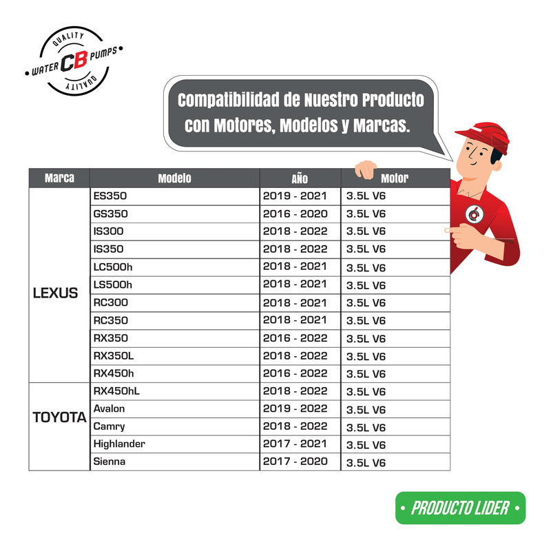 NEW WATER PUMP PREMIUM QUALITY INCLUDES: • Metal Impeller. • Installation Packaging. (Metal gasket) • Suitable for Car. Improve the lifespan of your car. •Greater durability. •Water leak correction. •Free Shipping Nationwide. •100% Secure Purchase. To ensure your purchase is a good experience, we suggest observing the following points: 1.- PART COMPATIBILITY • Check that the part is compatible with your vehicle, compare it with the published photos and information. • Review Compatibility Table. 2.- DELIVERY TIME • Depending on your location is the time of reception of the product. • Enter your Zip Code to find out the Shipping Time and Methods. • Logistics, delivery times, and packaging depend on Mercado Libre. 3.- WARRANTY • All our products have a 60-day warranty (from the date you receive your product). • A broken, wet, burned, rusty and/or scale-infected part invalidates the warranty. 4.- INVOICE • Upon receiving your product, you can generate your invoice online (We'll send you the link in the purchase chat). 5.- RETURNS • The piece must come in good condition and with all accessories included. • Returns are not accepted if it has already been installed or used in your car. We are a Pumping Station with 50 years of experience. • Specialists in the Sale of Automotive Water Pumps. • For Diesel and Gasoline Engines. • All Brands and Applications (Cars, Trucks, Forklifts, Power Plants, Tractors).