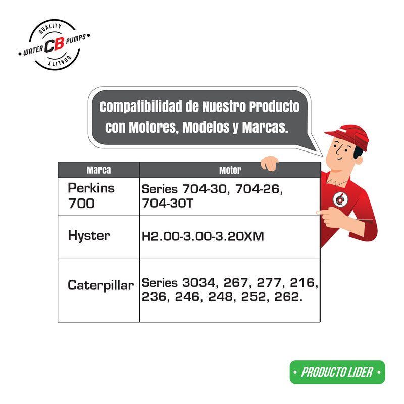 NEW WATER PUMP PREMIUM QUALITY INCLUDES: • Laminate Impeller. • Installation Packaging. • Suitable for forklifts. Improve the lifespan of your forklift. •Greater durability. •Water leak correction. •Free Shipping Nationwide. •100% Secure Purchase. To ensure your purchase is a good experience, we suggest observing the following points: 1.- PART COMPATIBILITY • Check that the part is compatible with your vehicle, compare it with the published photos and information. • Review Compatibility Table. 2.- DELIVERY TIME • Depending on your location is the time of reception of the product. • Enter your Zip Code to find out the Shipping Time and Methods. • Logistics, delivery times, and packaging depend on Mercado Libre. 3.- WARRANTY • All our products have a 60-day warranty (from the date you receive your product). • A broken, wet, burned, rusty and/or scale-infected part invalidates the warranty. 4.- INVOICE • Upon receiving your product, you can generate your invoice online (We'll send you the link in the purchase chat). 5.- RETURNS • The piece must come in good condition and with all accessories included. • Returns are not accepted if it has already been installed or used in your car. We are a Pumping Station with 50 years of experience. • Specialists in the Sale of Automotive Water Pumps. • For Diesel and Gasoline Engines. • All Brands and Applications (Cars, Trucks, Forklifts, Power Plants, Tractors).