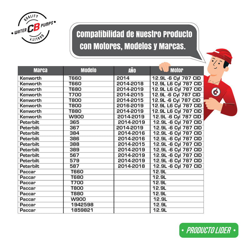 NEW WATER PUMP PREMIUM QUALITY INCLUDES: • Plastic Impeller. • Installation Packaging. • Truck Friendly. Improve the lifespan of your truck. •Greater durability. •Water leak correction. •Free Shipping Nationwide. •100% Secure Purchase. To ensure your purchase is a good experience, we suggest observing the following points: 1.- COMPATIBILITY OF THE PART • Check that the part is compatible with your vehicle, compare it with the published photos and information. • Review Compatibility Table. 2.- DELIVERY TIME • Depending on your location is the time of reception of the product. • Enter your Zip Code to find out the Shipping Time and Methods. • Logistics, delivery times, and packaging depend on Mercado Libre. 3.- WARRANTY • All our products have a 60-day warranty (from the date you receive your product). • A broken, wet, burned, rusty and/or scale-infected part invalidates the warranty. 4.- INVOICE • Upon receiving your product, you can generate your invoice online (We'll send you the link in the purchase chat). 5.- RETURNS • The piece must come in good condition and with all accessories included. • Returns are not accepted if it has already been installed or used in your car. We are a Pumping Station with 50 years of experience. • Specialists in the Sale of Automotive Water Pumps. • For Diesel and Gasoline Engines. • All Brands and Applications (Cars, Trucks, Forklifts, Power Plants, Tractors).