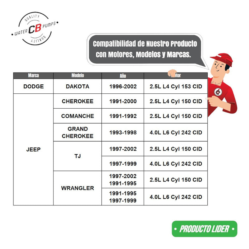NEW WATER PUMP PREMIUM QUALITY INCLUDES: • Metal Impeller. • Installation Packaging. • Suitable for Car/Truck. Improve the lifespan of your car. •Greater durability. •Water leak correction. •Free Shipping Nationwide. •100% Secure Purchase. To ensure your purchase is a good experience, we suggest observing the following points: 1.- COMPATIBILITY OF THE PART • Check that the part is compatible with your vehicle, compare it with the published photos and information. • Review Compatibility Table. 2.- DELIVERY TIME • Depending on your location is the time of reception of the product. • Enter your Zip Code to find out the Shipping Time and Methods. • Logistics, delivery times, and packaging depend on Mercado Libre. 3.- WARRANTY • All our products have a 60-day warranty (from the date you receive your product). • A broken, wet, burned, rusty and/or scale-infected part invalidates the warranty. 4.- INVOICE • Upon receiving your product, you can generate your invoice online (We'll send you the link in the purchase chat). 5.- RETURNS • The piece must come in good condition and with all accessories included. • Returns are not accepted if it has already been installed or used in your car. We are a Pumping Station with 50 years of experience. • Specialists in the Sale of Automotive Water Pumps. • For Diesel and Gasoline Engines. • All Brands and Applications (Cars, Trucks, Forklifts, Power Plants, Tractors).