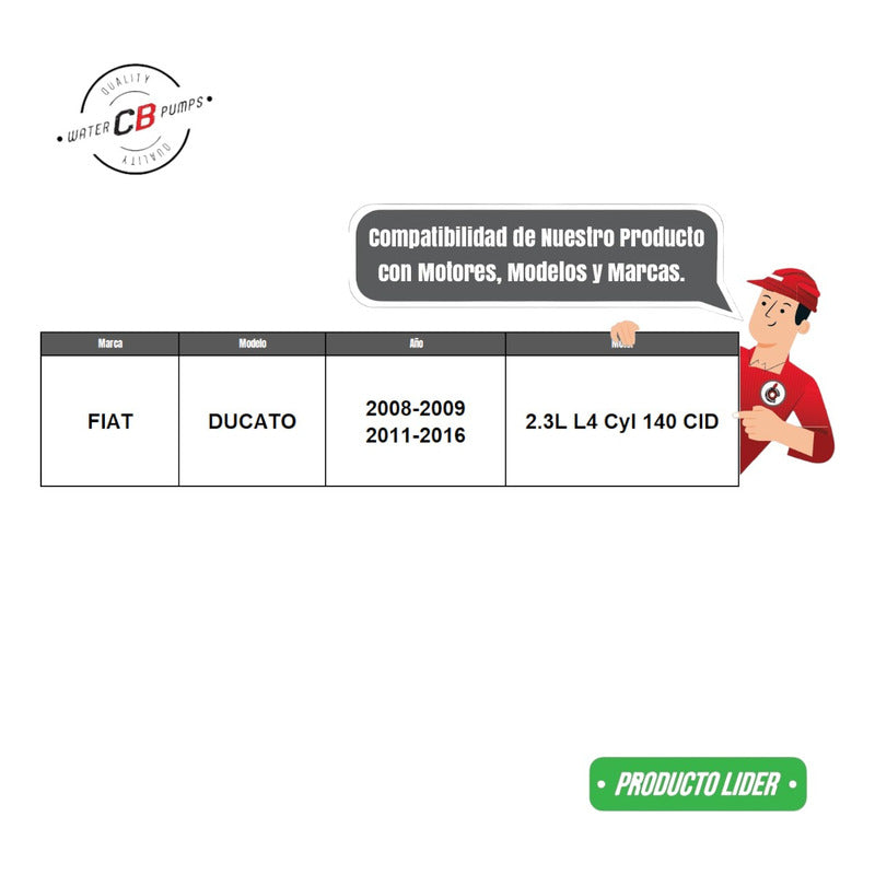 NEW WATER PUMP PREMIUM QUALITY INCLUDES: • Metal Impeller. • Installation Packaging. • Suitable for Trucks. Improve the lifespan of your car. •Greater durability. •Water leak correction. •Free Shipping Nationwide. •100% Secure Purchase. To ensure your purchase is a good experience, we suggest observing the following points: 1.- COMPATIBILITY OF THE PART • Check that the part is compatible with your vehicle, compare it with the published photos and information. • Review Compatibility Table. 2.- DELIVERY TIME • Depending on your location is the time of reception of the product. • Enter your Zip Code to find out the Shipping Time and Methods. • Logistics, delivery times, and packaging depend on Mercado Libre. 3.- WARRANTY • All our products have a 60-day warranty (from the date you receive your product). • A broken, wet, burned, rusty and/or scale-infected part invalidates the warranty. 4.- INVOICE • Upon receiving your product, you can generate your invoice online (We'll send you the link in the purchase chat). 5.- RETURNS • The piece must come in good condition and with all accessories included. • Returns are not accepted if it has already been installed or used in your car. We are a Pumping Station with 50 years of experience. • Specialists in the Sale of Automotive Water Pumps. • For Diesel and Gasoline Engines. • All Brands and Applications (Cars, Trucks, Forklifts, Power Plants, Tractors).