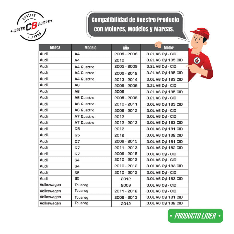 NEW WATER PUMP PREMIUM QUALITY INCLUDES: • Sheet Impeller. • Installation Packaging. • Suitable for Car/Truck. Improve the lifespan of your car. •Greater durability. •Water leak correction. •Free Shipping Nationwide. •100% Secure Purchase. To ensure your purchase is a good experience, we suggest observing the following points: 1.- COMPATIBILITY OF THE PART • Check that the part is compatible with your vehicle, compare it with the published photos and information. • Review Compatibility Table. 2.- DELIVERY TIME • Depending on your location is the time of reception of the product. • Enter your Zip Code to find out the Shipping Time and Methods. • Logistics, delivery times, and packaging depend on Mercado Libre. 3.- WARRANTY • All our products have a 60-day warranty (from the date you receive your product). • A broken, wet, burned, rusty and/or scale-infected part invalidates the warranty. 4.- INVOICE • Upon receiving your product, you can generate your invoice online (We'll send you the link in the purchase chat). 5.- RETURNS • The piece must come in good condition and with all accessories included. • Returns are not accepted if it has already been installed or used in your car. We are a Pumping Station with 50 years of experience. • Specialists in the Sale of Automotive Water Pumps. • For Diesel and Gasoline Engines. • All Brands and Applications (Cars, Trucks, Forklifts, Power Plants, Tractors).