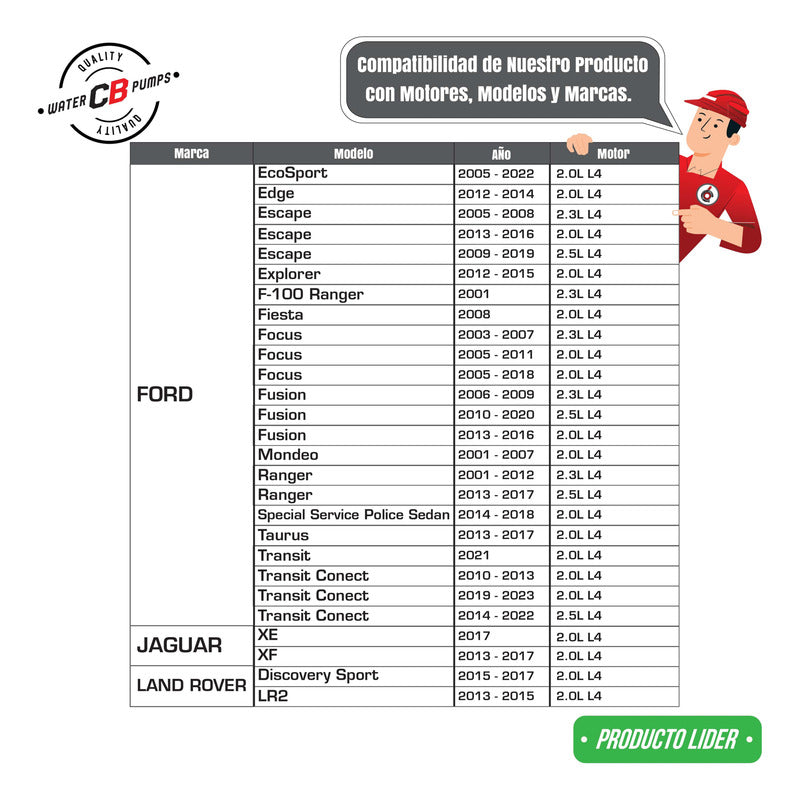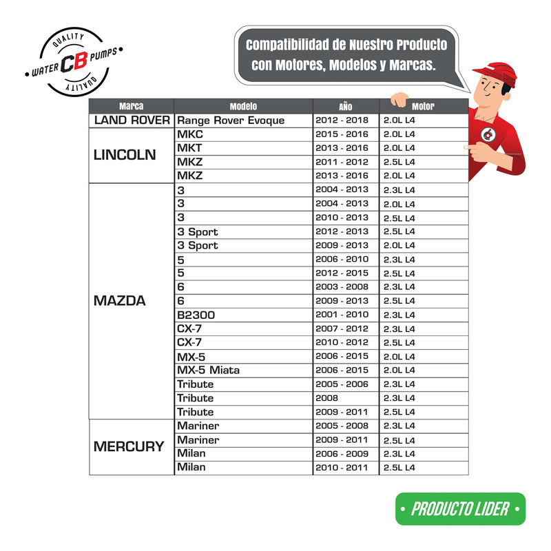 NEW WATER PUMP PREMIUM QUALITY INCLUDES: • Aluminum impeller. • Installation Packaging. • Suitable for Car. Improve the lifespan of your car. •Greater durability. •Water leak correction. •Free Shipping Nationwide. •100% Secure Purchase. To ensure your purchase is a good experience, we suggest observing the following points: 1.- COMPATIBILITY OF THE PART • Check that the part is compatible with your vehicle, compare it with the published photos and information. • Review Compatibility Table. 2.- DELIVERY TIME • Depending on your location is the time of reception of the product. • Enter your Zip Code to find out the Shipping Time and Methods. • Logistics, delivery times, and packaging depend on Mercado Libre. 3.- WARRANTY • All our products have a 60-day warranty (from the date you receive your product). • A broken, wet, burned, rusty and/or scale-infected part invalidates the warranty. 4.- INVOICE • Upon receiving your product, you can generate your invoice online (We'll send you the link in the purchase chat). 5.- RETURNS • The piece must come in good condition and with all accessories included. • Returns are not accepted if it has already been installed or used in your car. We are a Pumping Station with 50 years of experience. • Specialists in the Sale of Automotive Water Pumps. • For Diesel and Gasoline Engines. • All Brands and Applications (Cars, Trucks, Forklifts, Power Plants, Tractors).