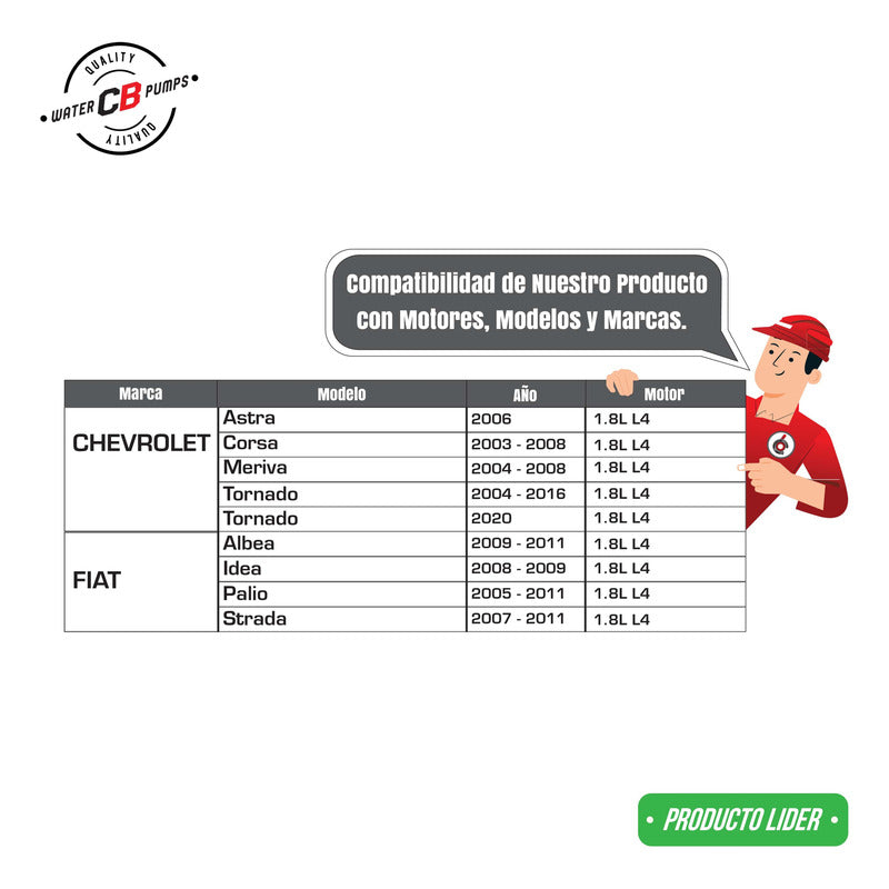 PUMPING STATION NEW WATER PUMP (19 TOOTH) PREMIUM QUALITY INCLUDES: • Metal Impeller. • Installation Packaging. • Suitable for Car. Improve the lifespan of your car. •Greater durability. •Water leak correction. •Free Shipping Nationwide. •100% Secure Purchase. To ensure your purchase is a good experience, we suggest observing the following points: 1.- PART COMPATIBILITY • Check that the part is compatible with your vehicle, compare it with the published photos and information. • Review Compatibility Table. 2.- DELIVERY TIME • Depending on your location is the time of reception of the product. • Enter your Zip Code to find out the Shipping Time and Methods. • Logistics, delivery times, and packaging depend on Mercado Libre. 3.- WARRANTY • All our products have a 60-day warranty (from the date you receive your product). • A broken, wet, burned, rusty and/or scale-infected part invalidates the warranty. 4.- INVOICE • Upon receiving your product, you can generate your invoice online (We'll send you the link in the purchase chat). 5.- RETURNS • The piece must come in good condition and with all accessories included. • Returns are not accepted if it has already been installed or used in your car. We are a Pumping Station with 50 years of experience. • Specialists in the Sale of Automotive Water Pumps. • For Diesel and Gasoline Engines. • All Brands and Applications (Cars, Trucks, Forklifts, Power Plants, Tractors).
